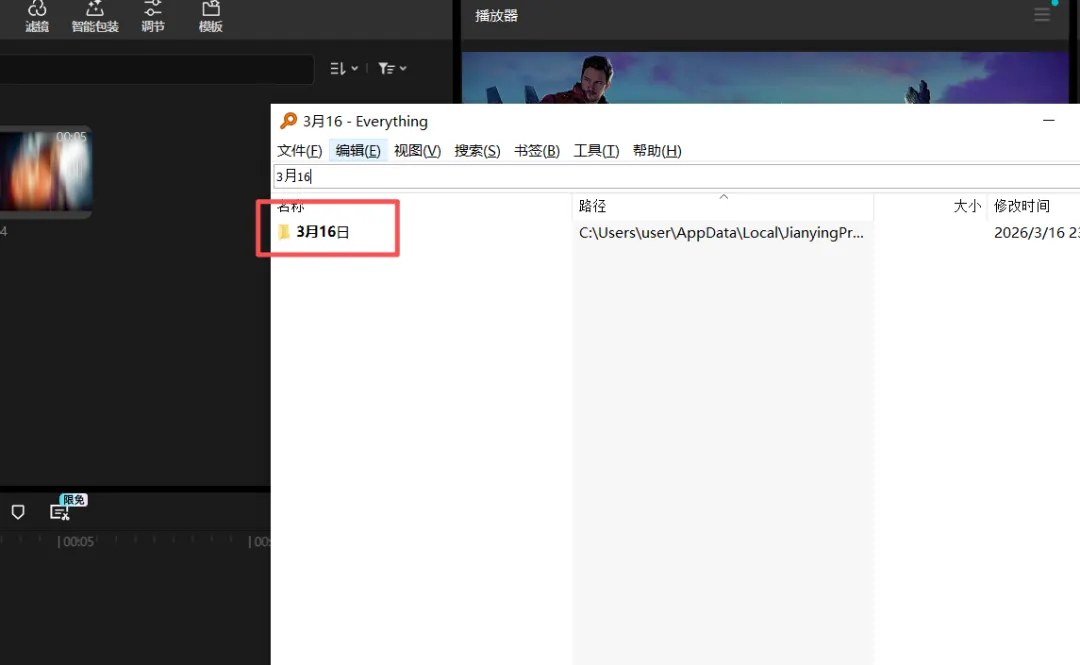 如果你觉得找到这个位置比较麻烦,那你直接用Everything软件搜索这个日期3月16日,我的右上角显示是3月16日