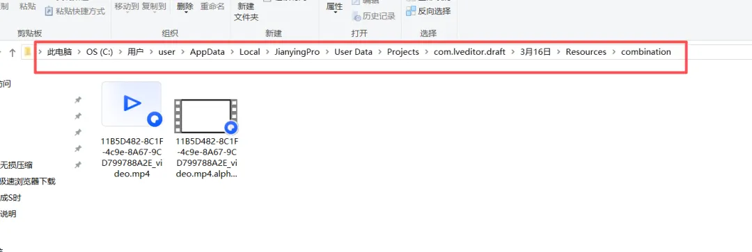 位置路径大概是C:\Users\user\AppData\Local\JianyingPro\User Data\Projects\com.lveditor.draft\3月16日\Resources\combination