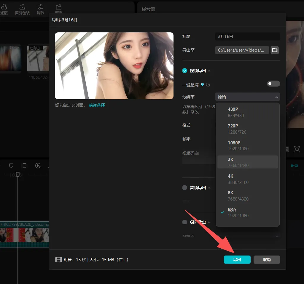 点击右上角进行导出,可以自行选择导出视频的分辨率,无水印导出。不过,记得设置不要更新