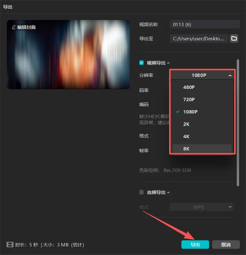最重要是导出时候是不需要登录账号的,点击右上角导出,直接免登陆无水印导出,画质可以随你选择1080P、2K、8K,导出后打开文件夹就可以看到你导出的视频了