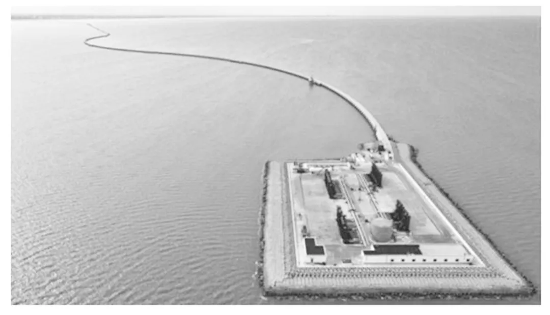 “海油陆采”是开发水深不足3米、距离陆地较近的极浅海油藏的有效方式。近年来,胜利油田在渤海湾建设自海岸向海中延伸的道路,在道路的末端建设人工岛,在岛上钻井开采海底石油。下图为“胜利油田人工采油岛景观图”。据此完成5~6题。