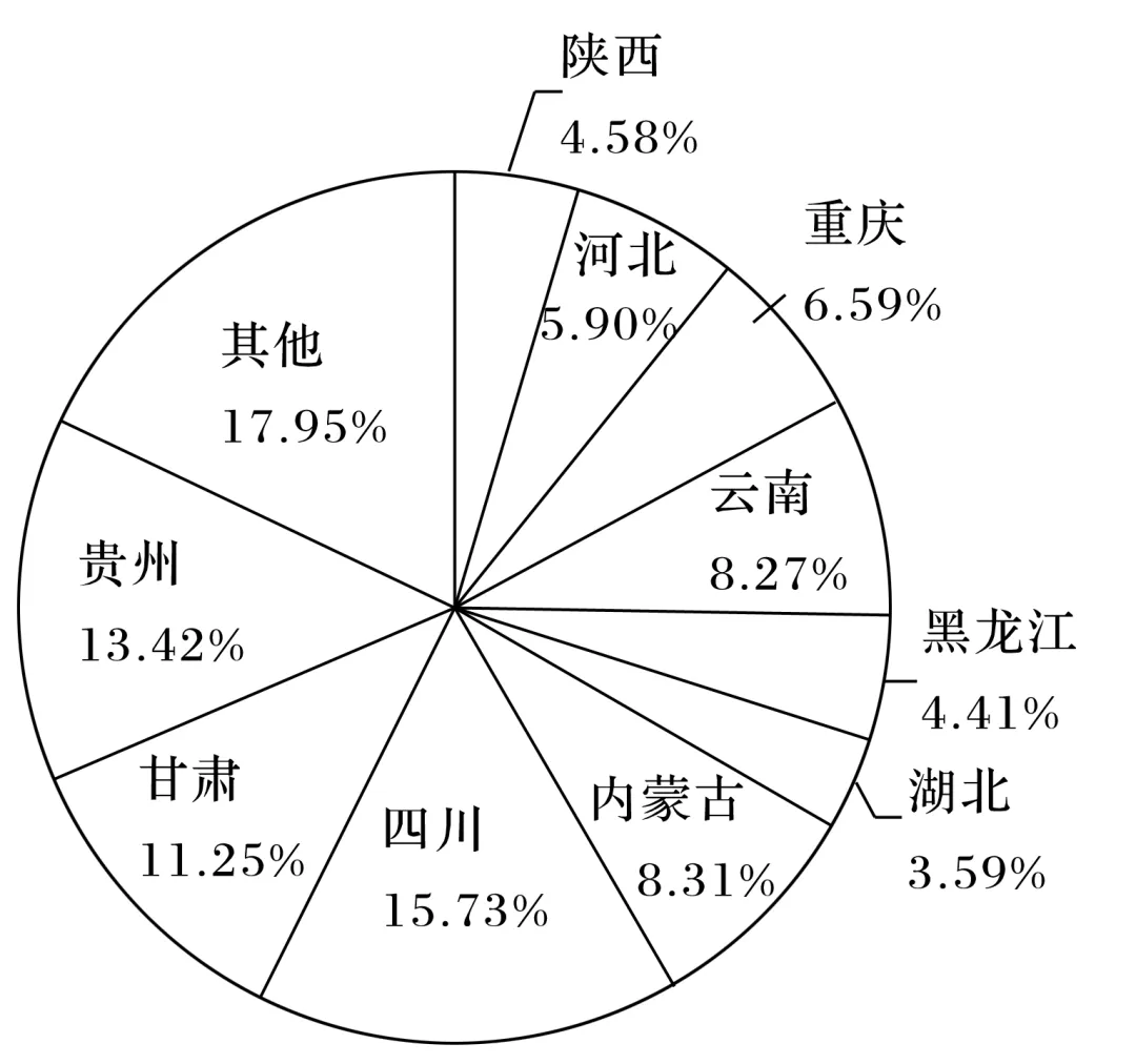 土豆节水节地,稳产高产,营养素全面,脂肪含量低,蛋白质品质高,早已成为全球第四大粮食作物。欧洲国家会把土豆做成土豆粉,进一步制作成面包、点心。下图为“2018年我国不同省份土豆产量占比扇形图”。完成9~10题。