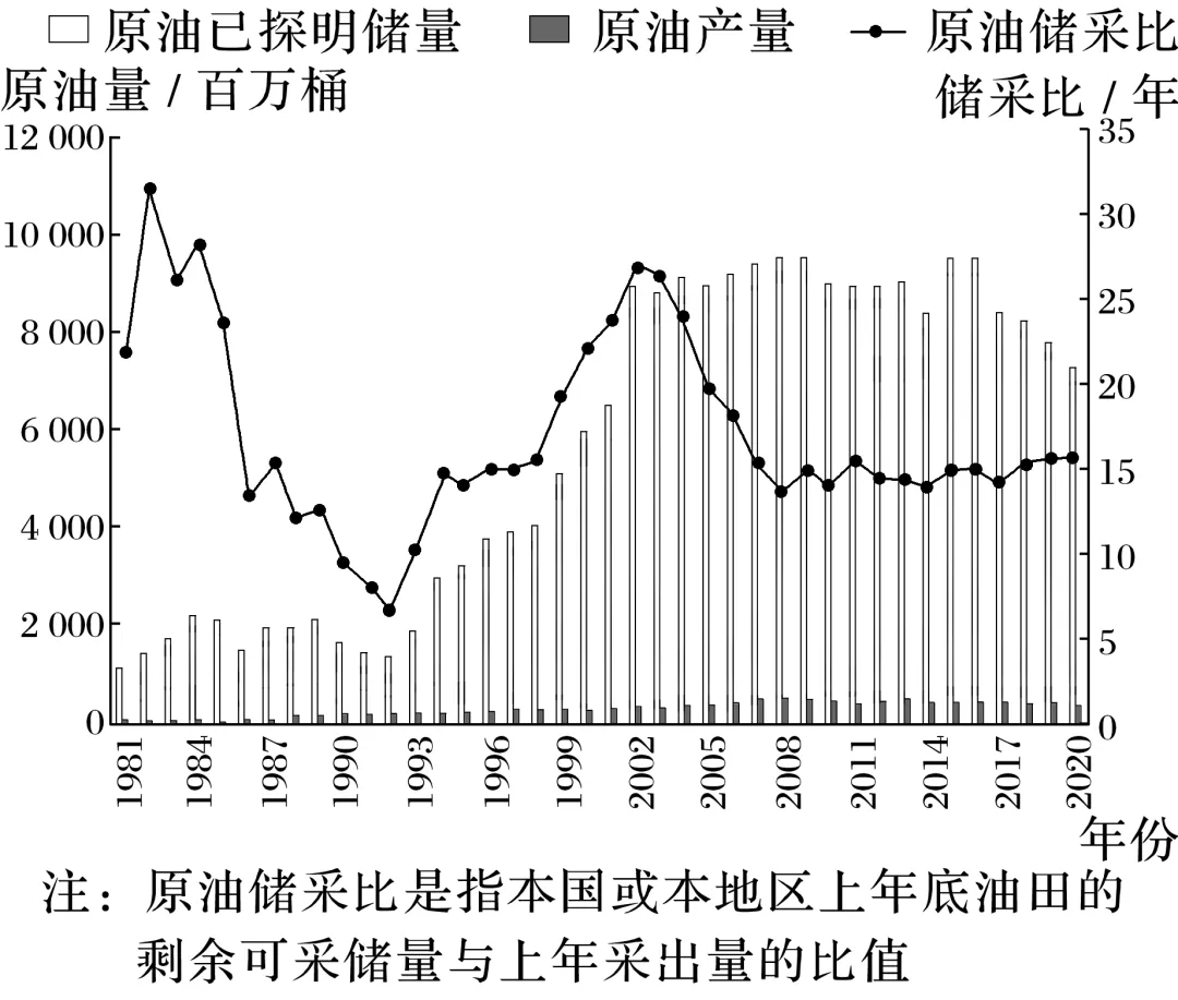 (2024·陕西西安阶段练习)安哥拉位于非洲西南部,生产的原油以出口为主,是我国第三大原油进口来源国,2018年中安两国签署“一带一路”合作文件。下图示意1981~2020年安哥拉原油已探明储量、产量及储采比变化。据此完成11~13题。