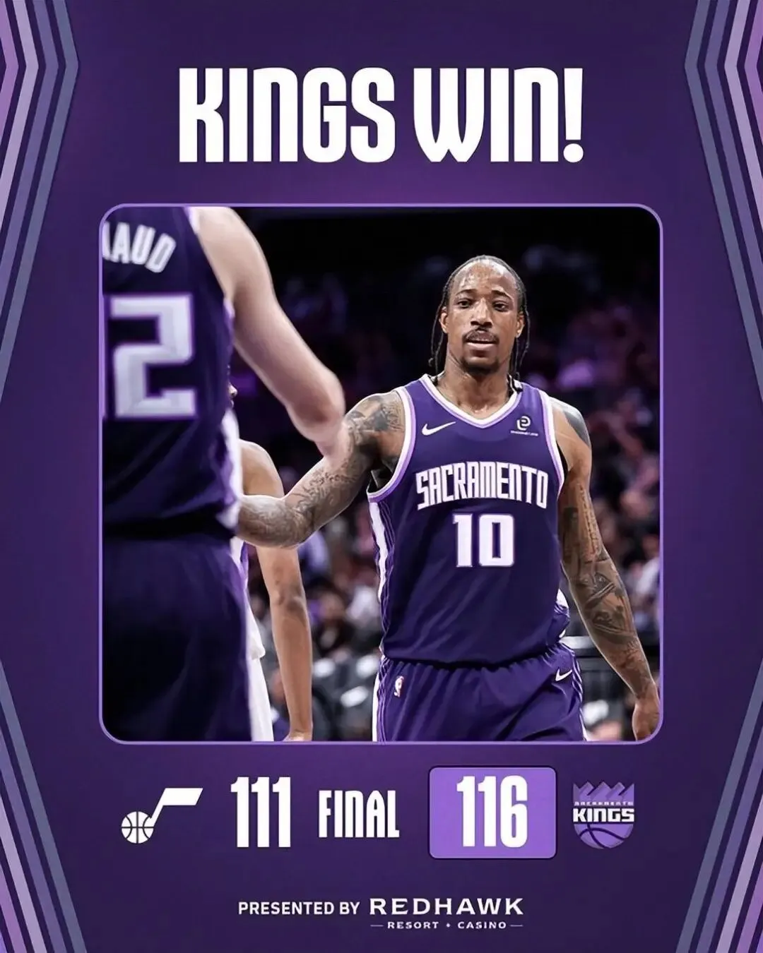 国王今天在主场以116-111战胜爵士,取得两连胜,也送给爵士3连败。国王战绩依旧只有18胜51负,排在西部倒数第一,而爵士则以20胜48负的战绩排在西部倒数第二。两队本赛季4次交手已经全部结束,2胜2负打成平手。