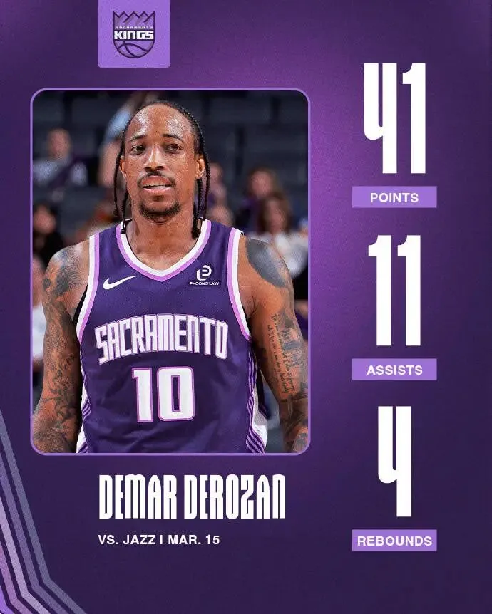 德罗赞今天依旧状态火热,出战38分钟,21投11中,其中三分球3投1中,罚球21投18中,得到41分4篮板11助攻3抢断,也有5次失误,正负值+16全队最高。41分创德罗赞本赛季个人单场得分新高,这也是他生涯第27次砍下40+。上一场对阵快船,德罗赞也砍下27分7助攻。而再之前一场对阵黄蜂,德罗赞砍下39分4篮板6助攻,只差一分就能拿到40+,可惜成为了空砍。