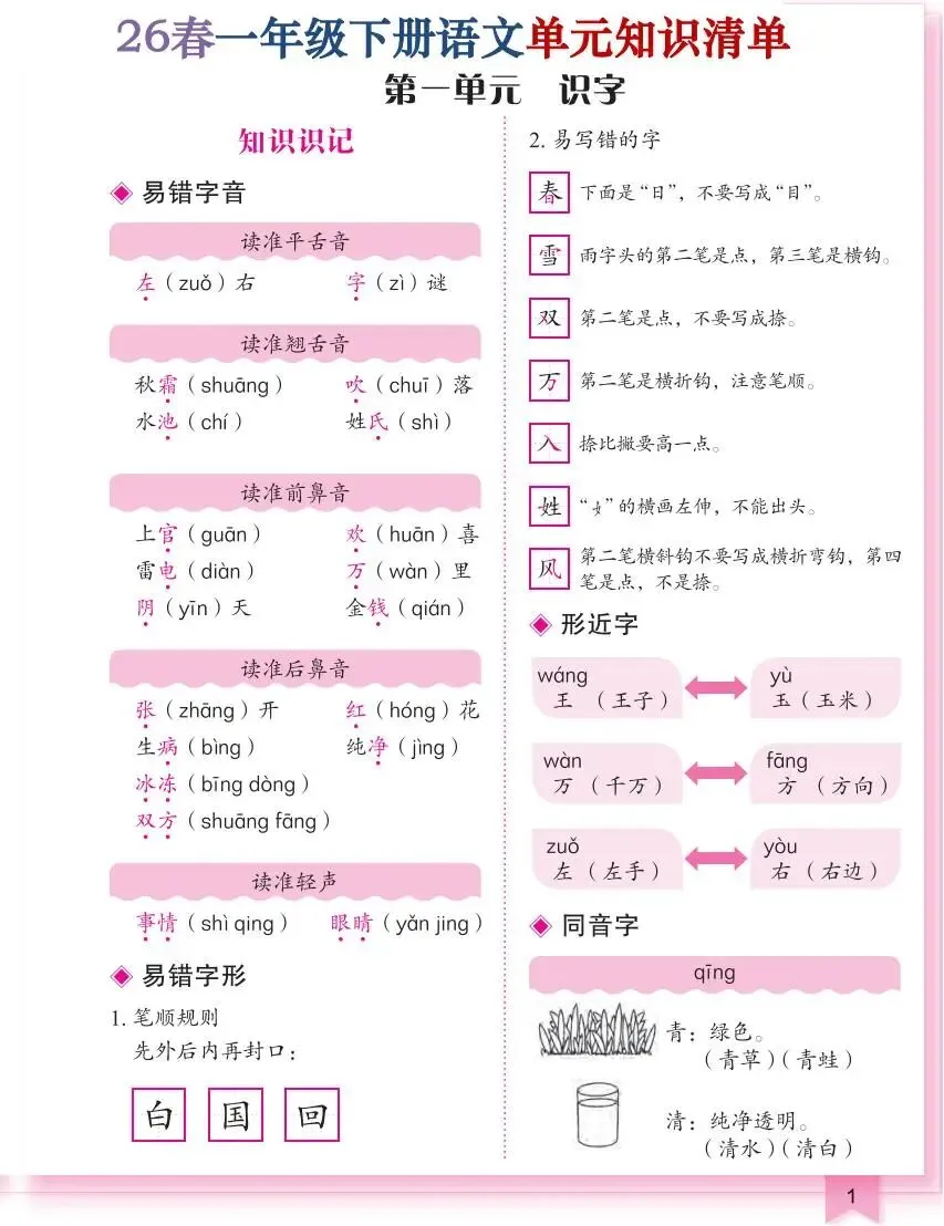 2026年春一年级下册语文部统版《单元知识清单》,电子版可下载打印