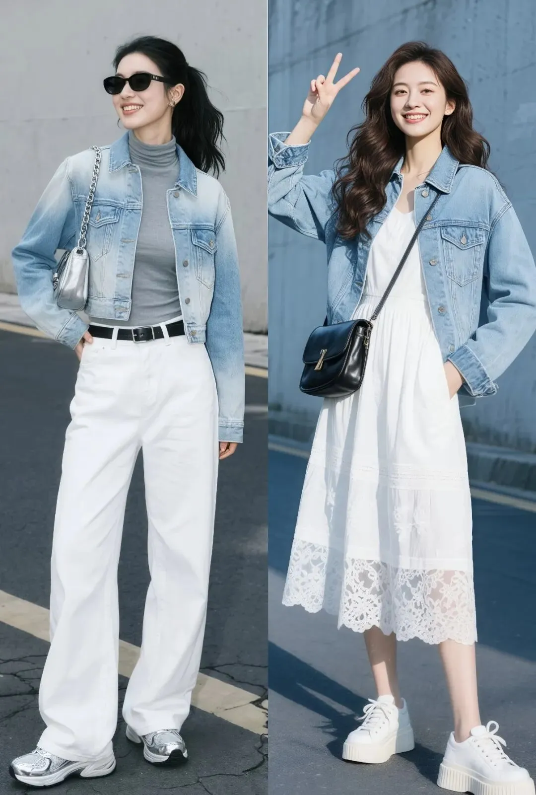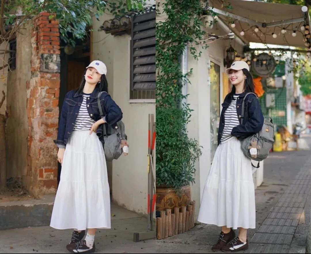 第二,牛仔外套 + 白色裙装,刚柔并济超温柔。蓝色牛仔的休闲硬朗配白色蕾丝长裙的柔美,或是基础款牛仔搭简约白色半身裙,基础色搭配和谐不挑人,清新自然的春日感直接拉满,还能瞬间提升温柔气质,普通人穿也超美。