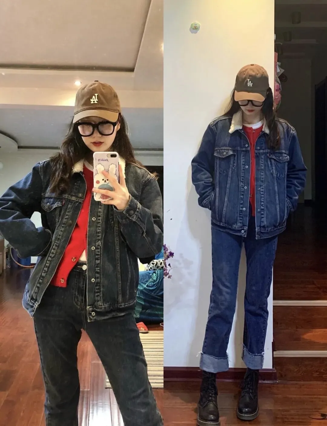 第一,牛仔外套 + 红色系内搭,复古提气色。不管是复古蓝牛仔外套配红色针织衫,还是深蓝款搭红色连衣裙,丹宁的硬朗中和红色的明艳,复古时髦拉满,还能显白两个度,上班出游穿都合适,松松弛弛就赢了。
