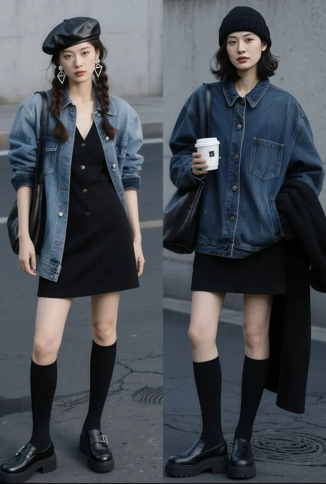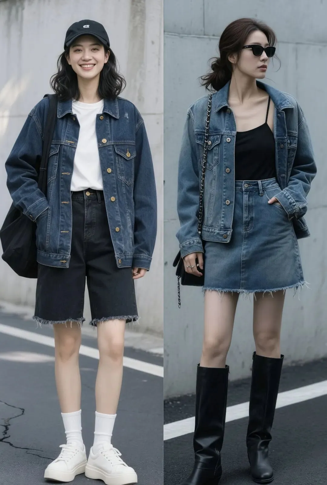 色彩搭配别贪多,牛仔外套主打一个简约,内搭和下装选 1-2 个主色即可,深色牛仔外套配黑色连衣裙时,搭一双米白色运动鞋,打破沉闷感,注入清爽轻盈,瞬间年轻化。