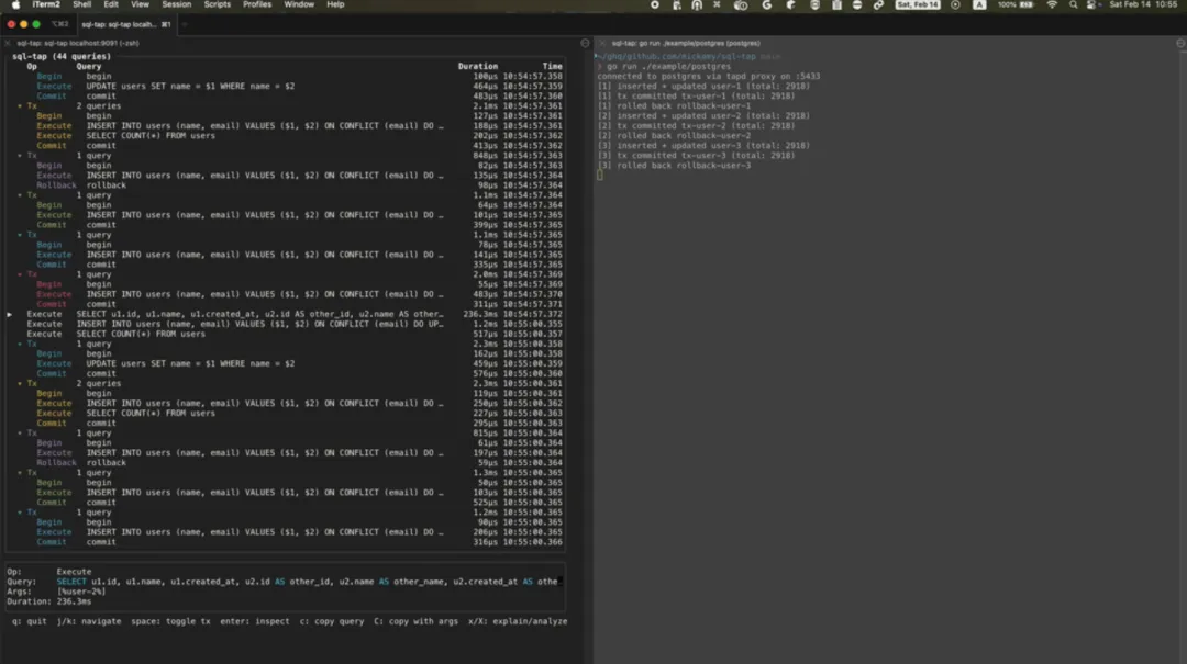 sql-tap的使用体验非常友好,提供了多种安装方式,比如用 Homebrew、Go 安装、下载二进制文件或者 Docker 运行。