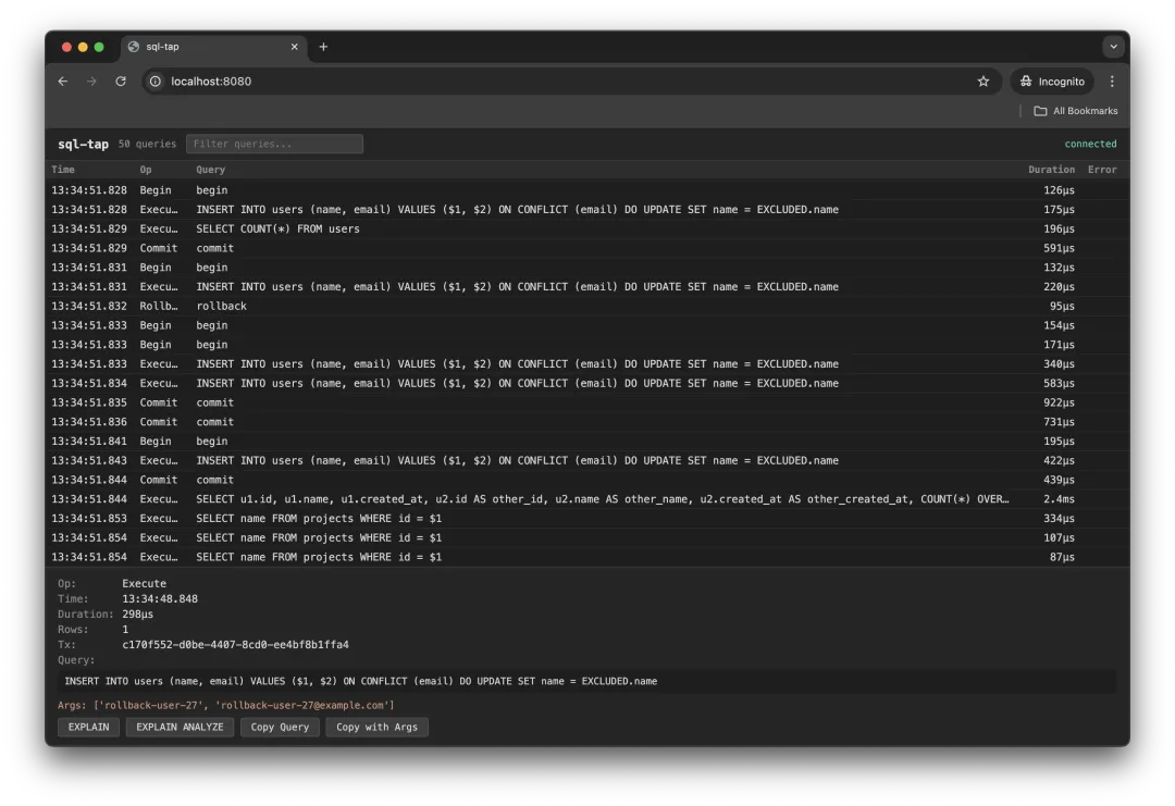 sql-tapd -driver postgres -listen :5433 -upstream localhost:5432