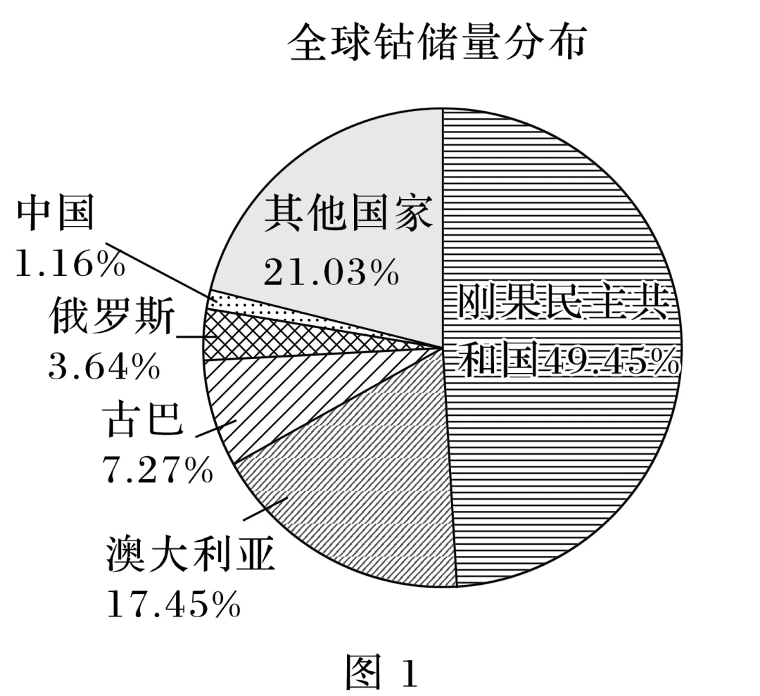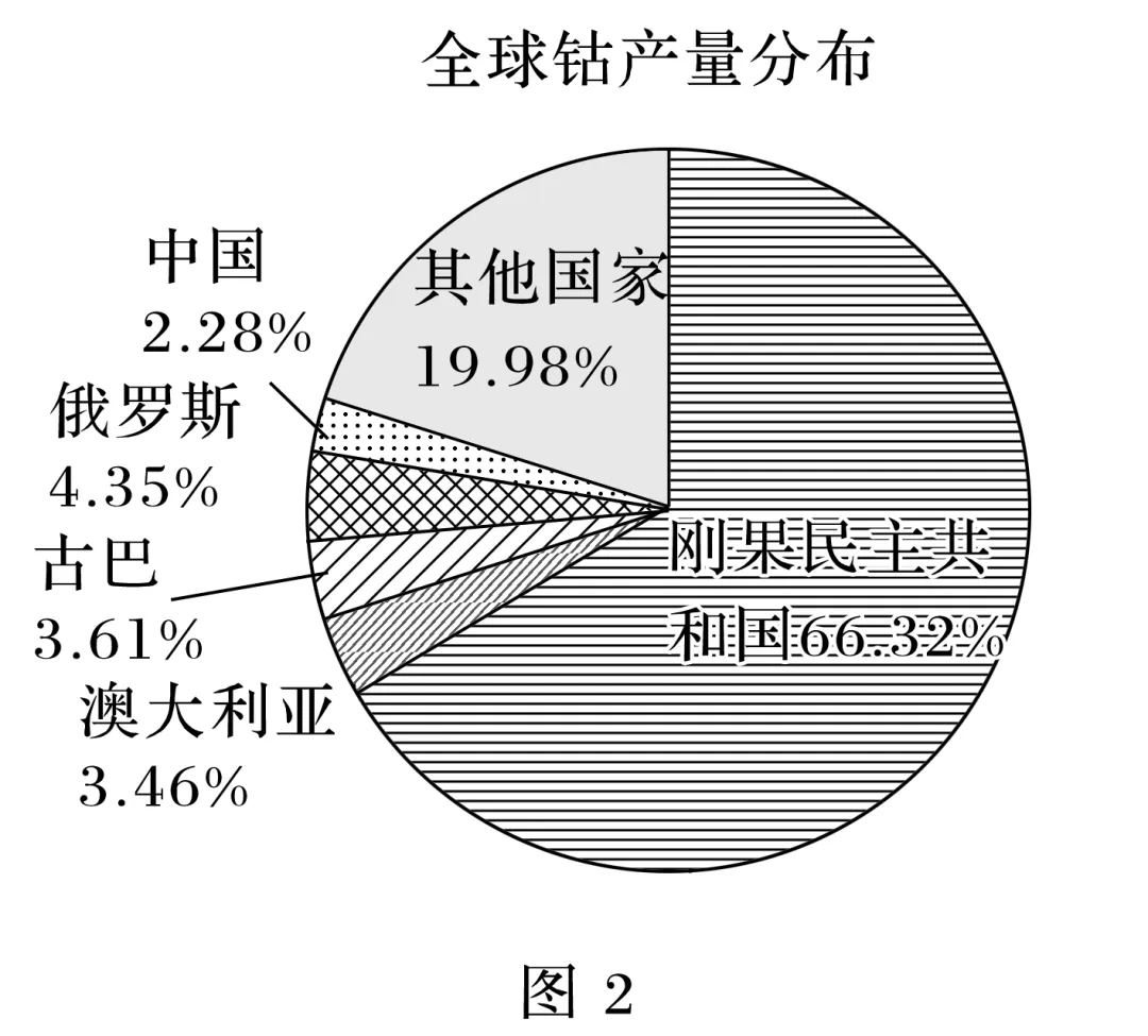 (2024·山西大同联考)钴是电池材料中的关键元素,在新能源产业中具有重要地位,全球60%以上的钴矿精炼加工在中国,且60%以上的精炼钴消费在中国、欧盟和美国。图1、图2分别示意全球钴矿的储量和产量分布。完成8~9题。