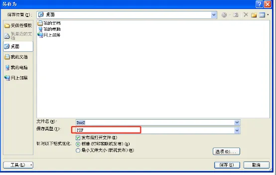 我们再点击“文件”,点击“另存为”,保存类型选择“PDF”,保存位置选择桌面,文件名输入你想要的文件名,点击“保存” 就可以了。