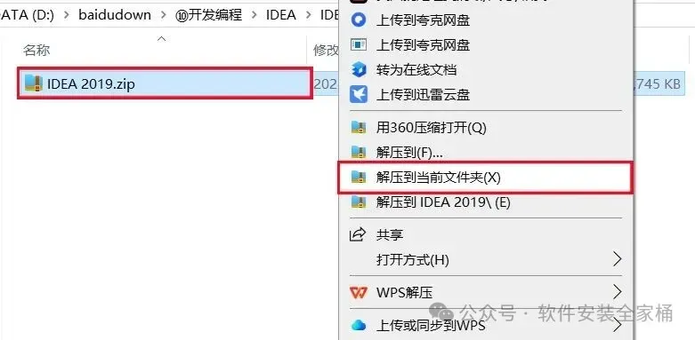 1、下载IntelliJ IDEA 2019软件安装包到电脑上,右键选择【解压到当前文件夹】