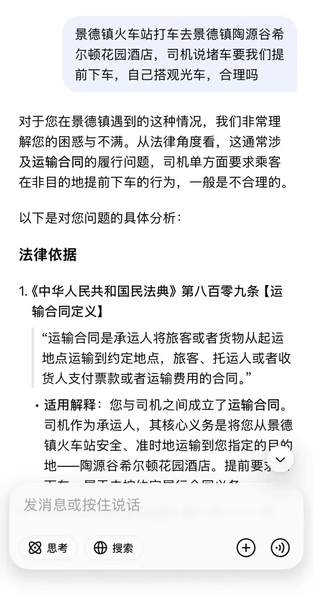 提问2:“司机说堵车要我们提前下车,自己搭观光车,合理吗?”