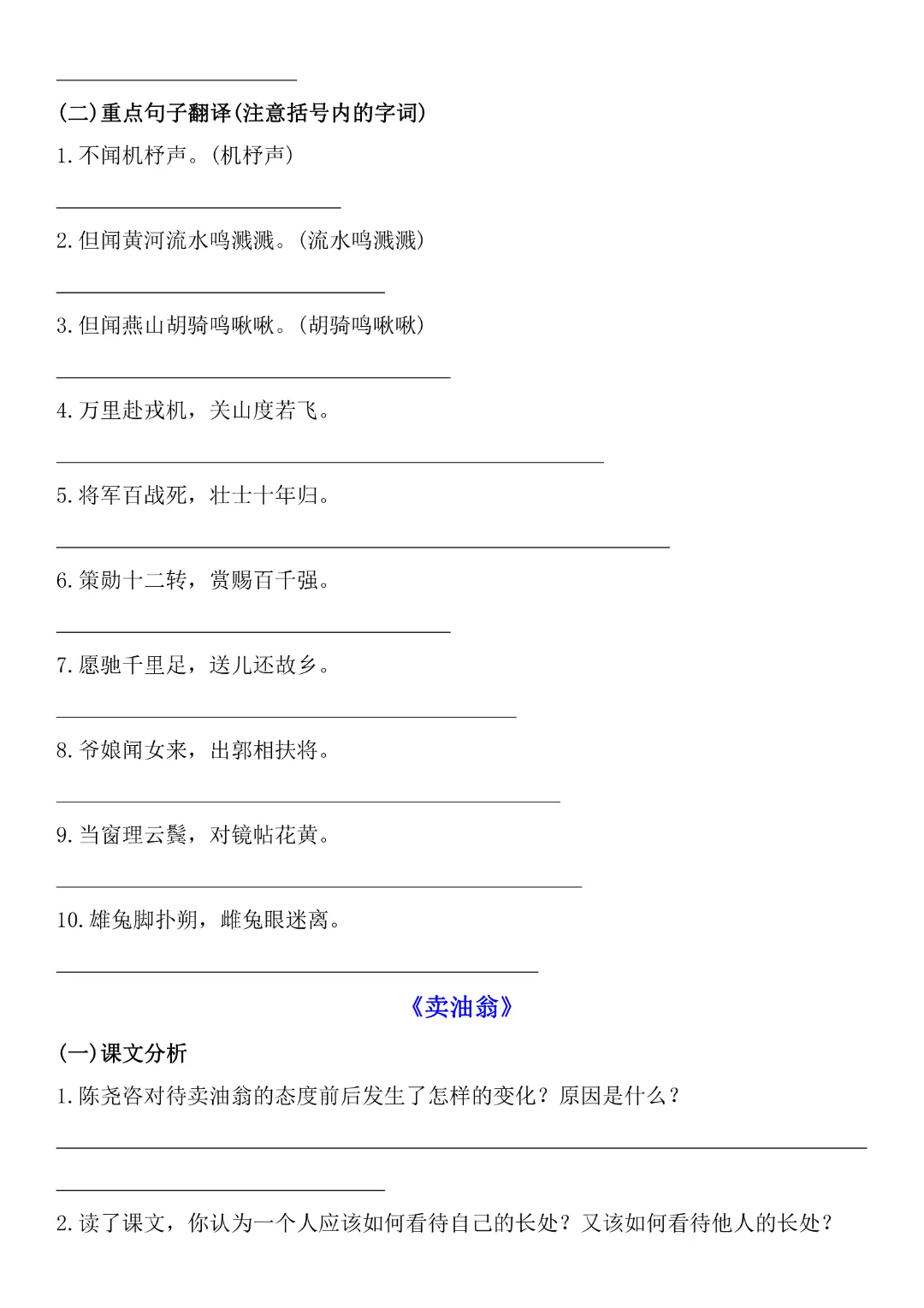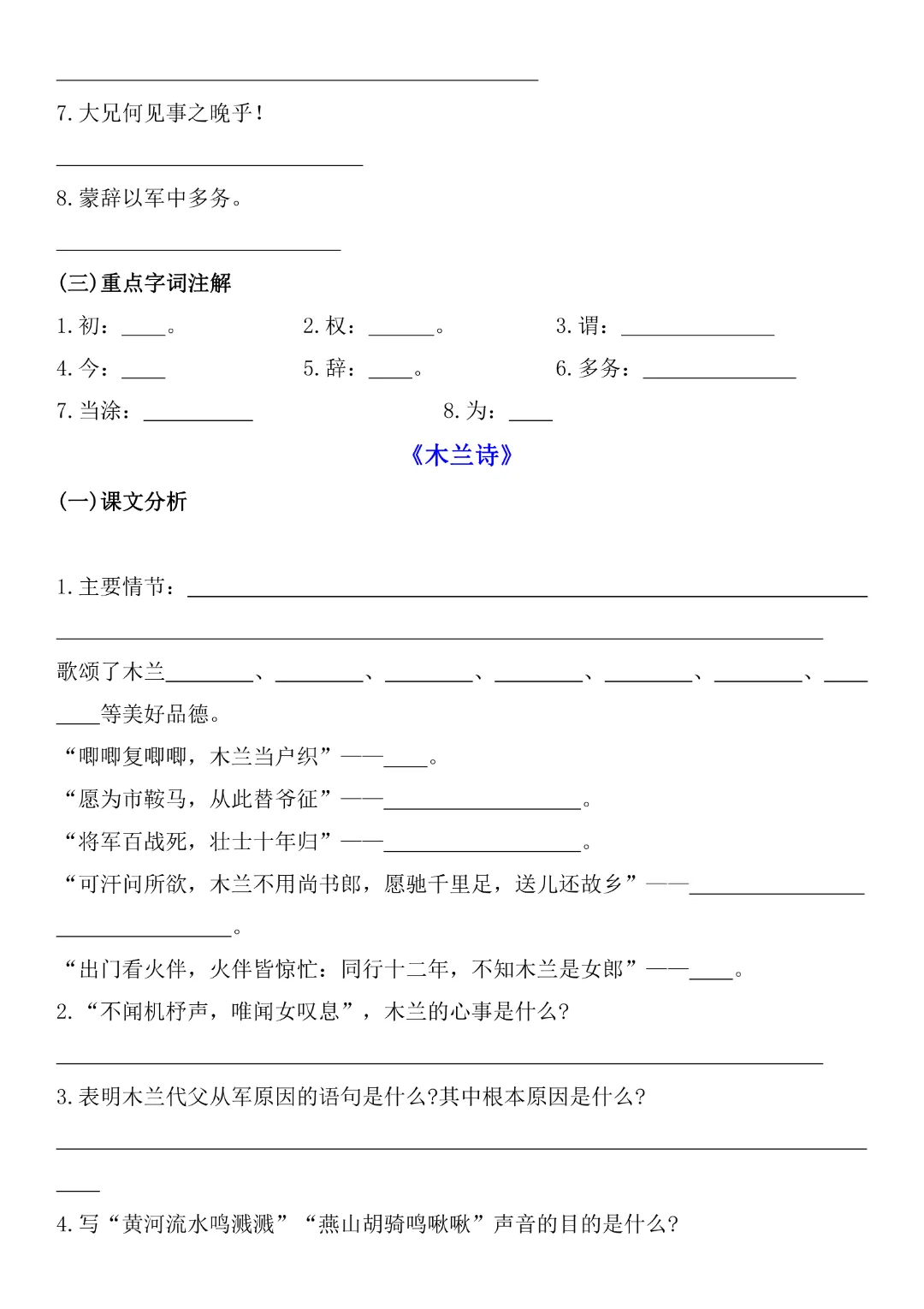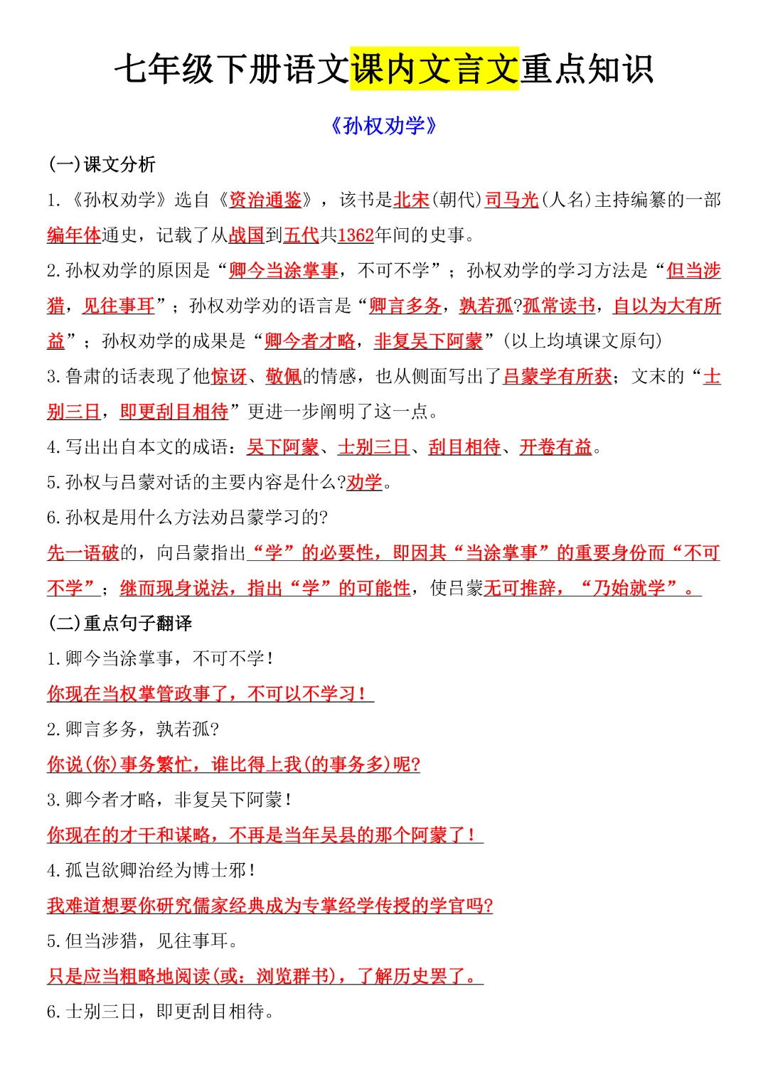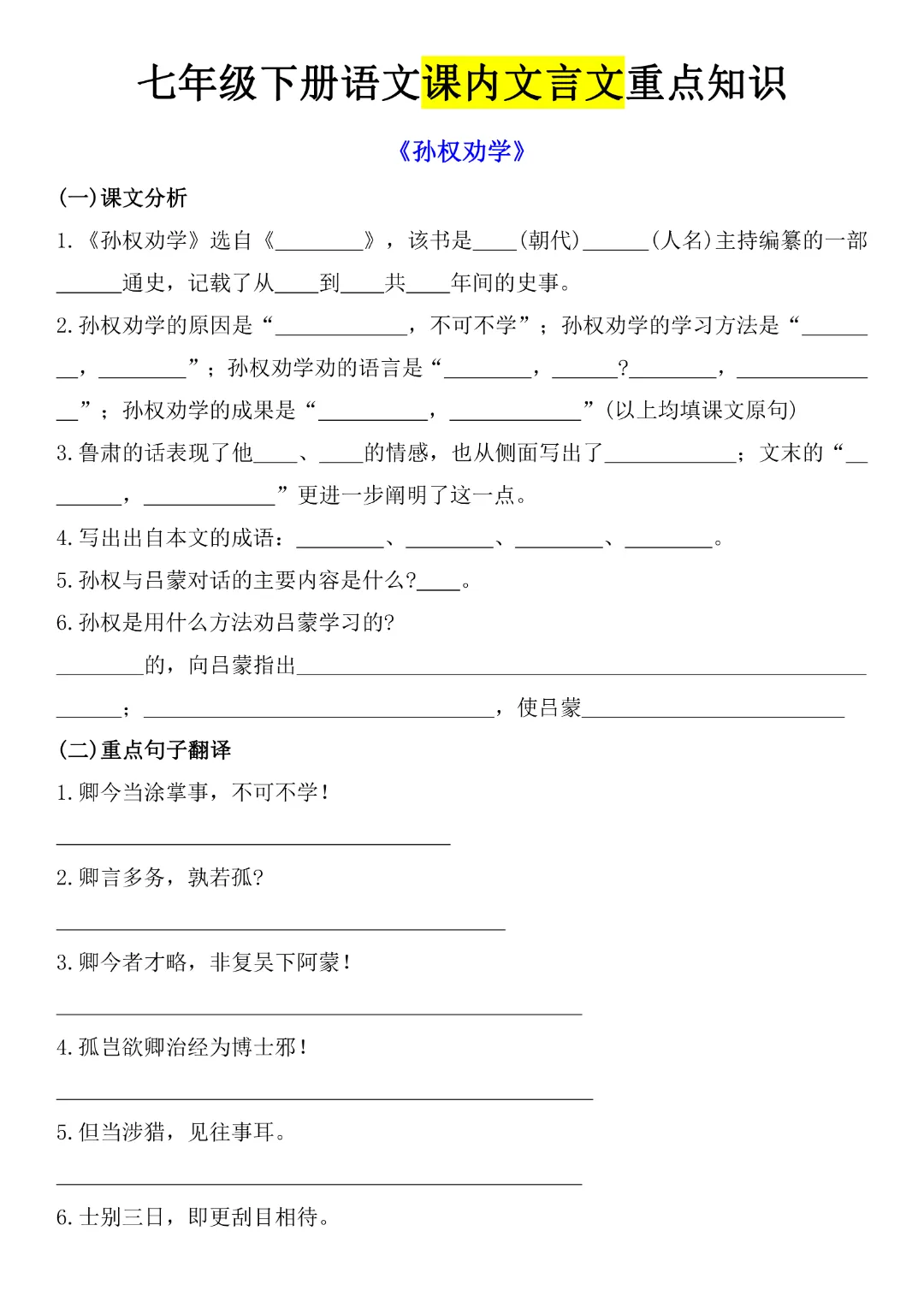 今天给大家分享的是:【七年级下册语文】【部编版】课内文言文重点知识专项练习带答案|完整高清电子版可打印
