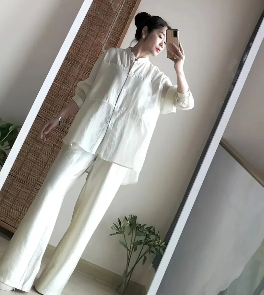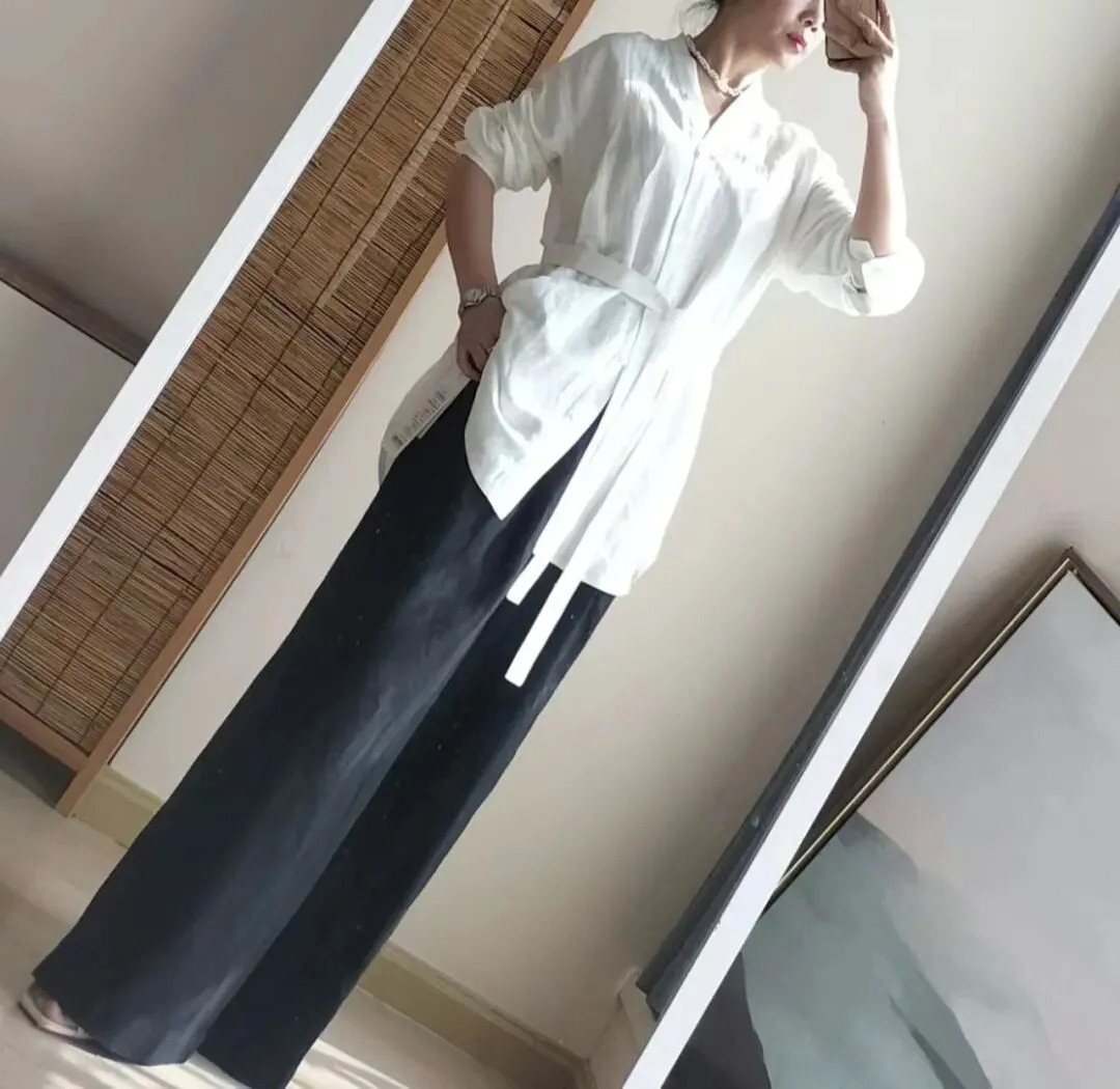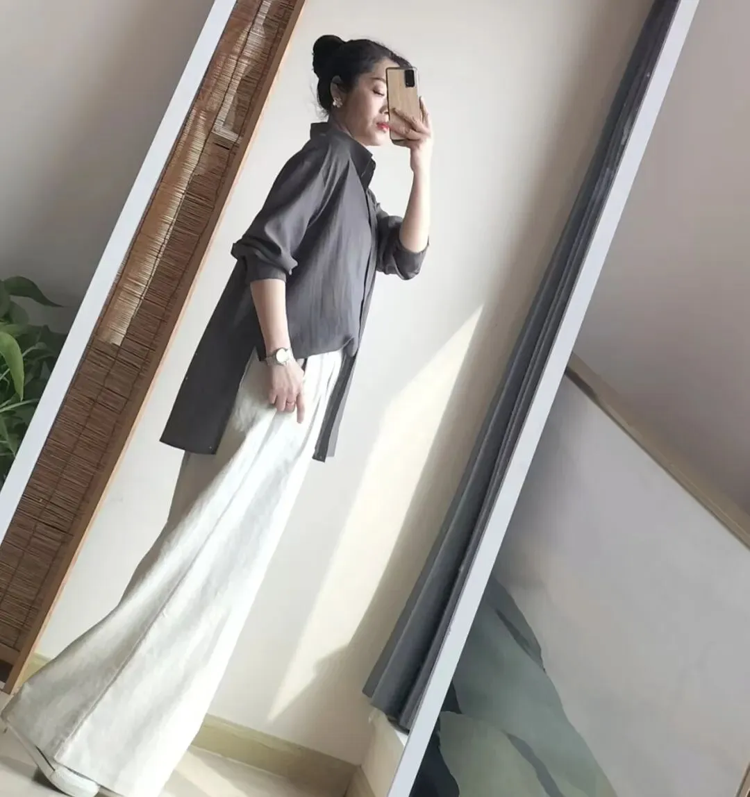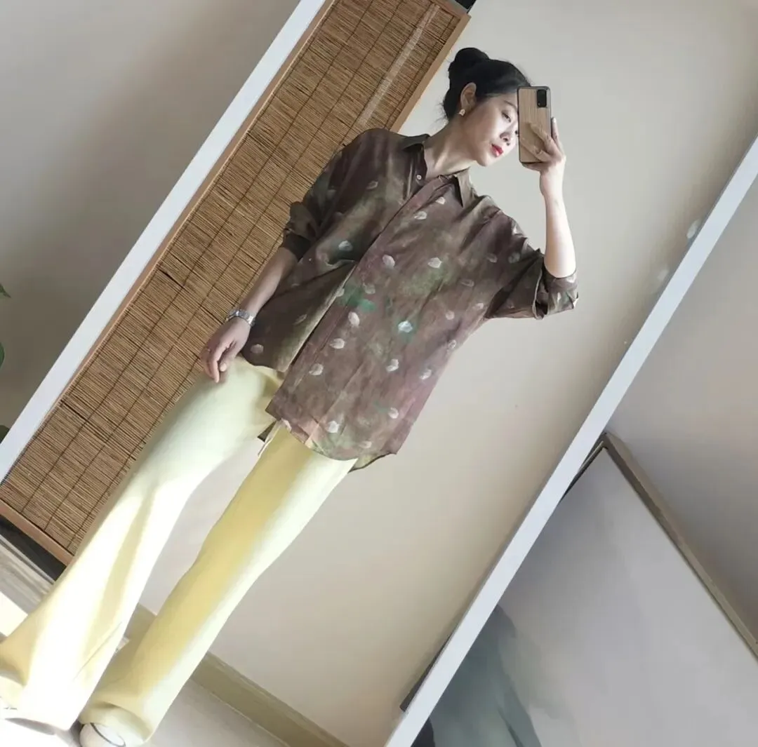 桑蚕丝.棉的拼接款衬衣,搭松紧腰的阔腿长裤✨轻盈.质感