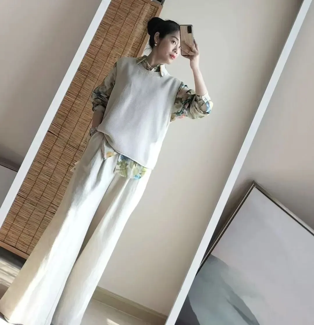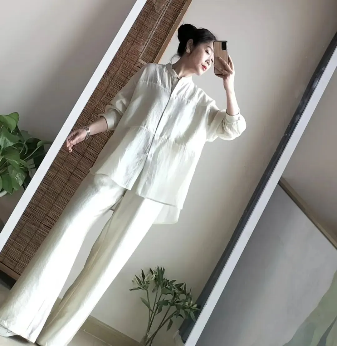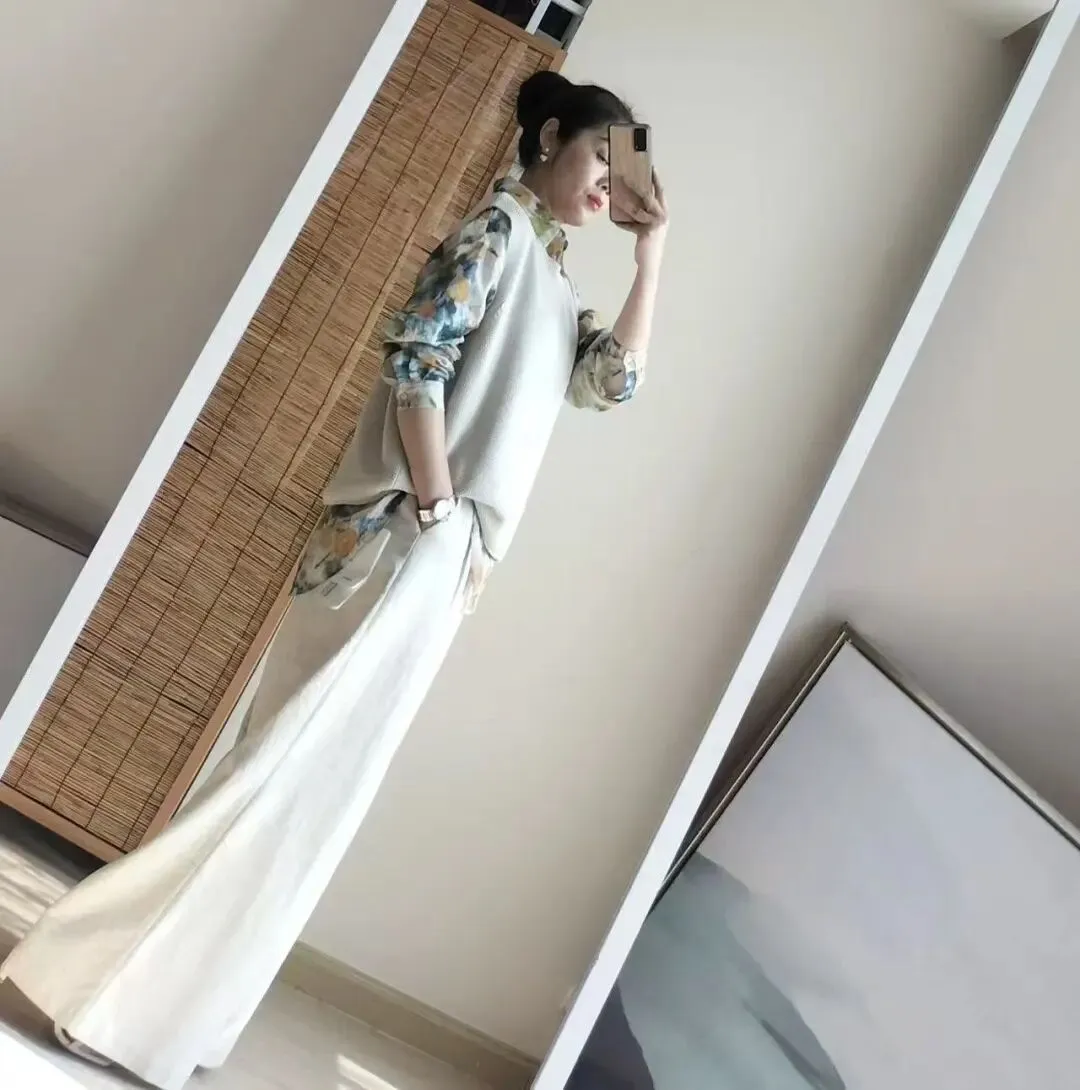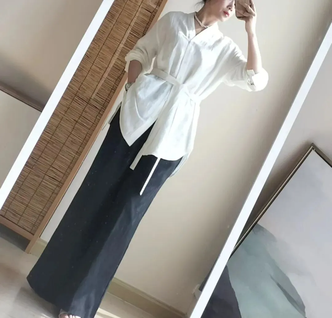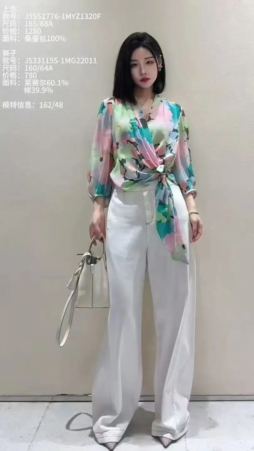 桑蚕丝.棉的拼接款衬衣,搭松紧腰的阔腿长裤✨轻盈.质感