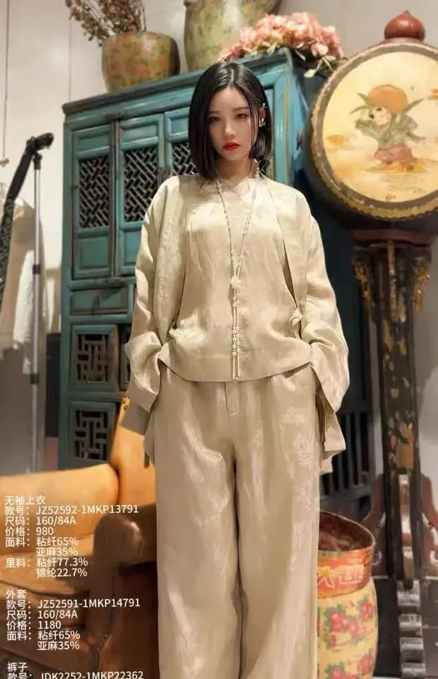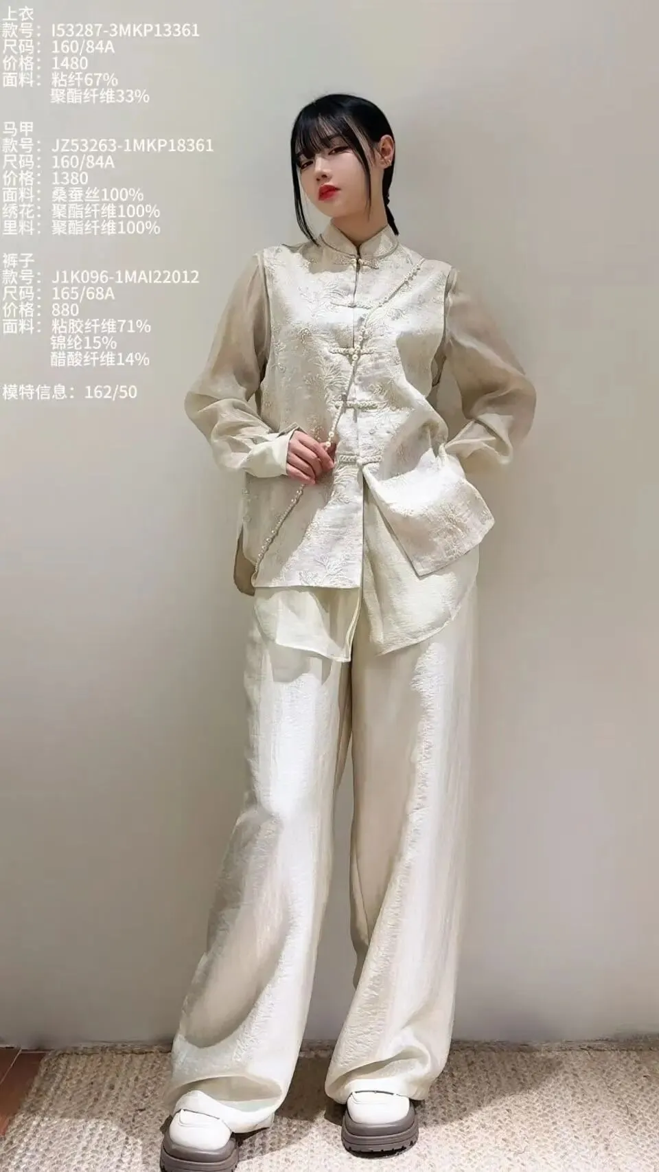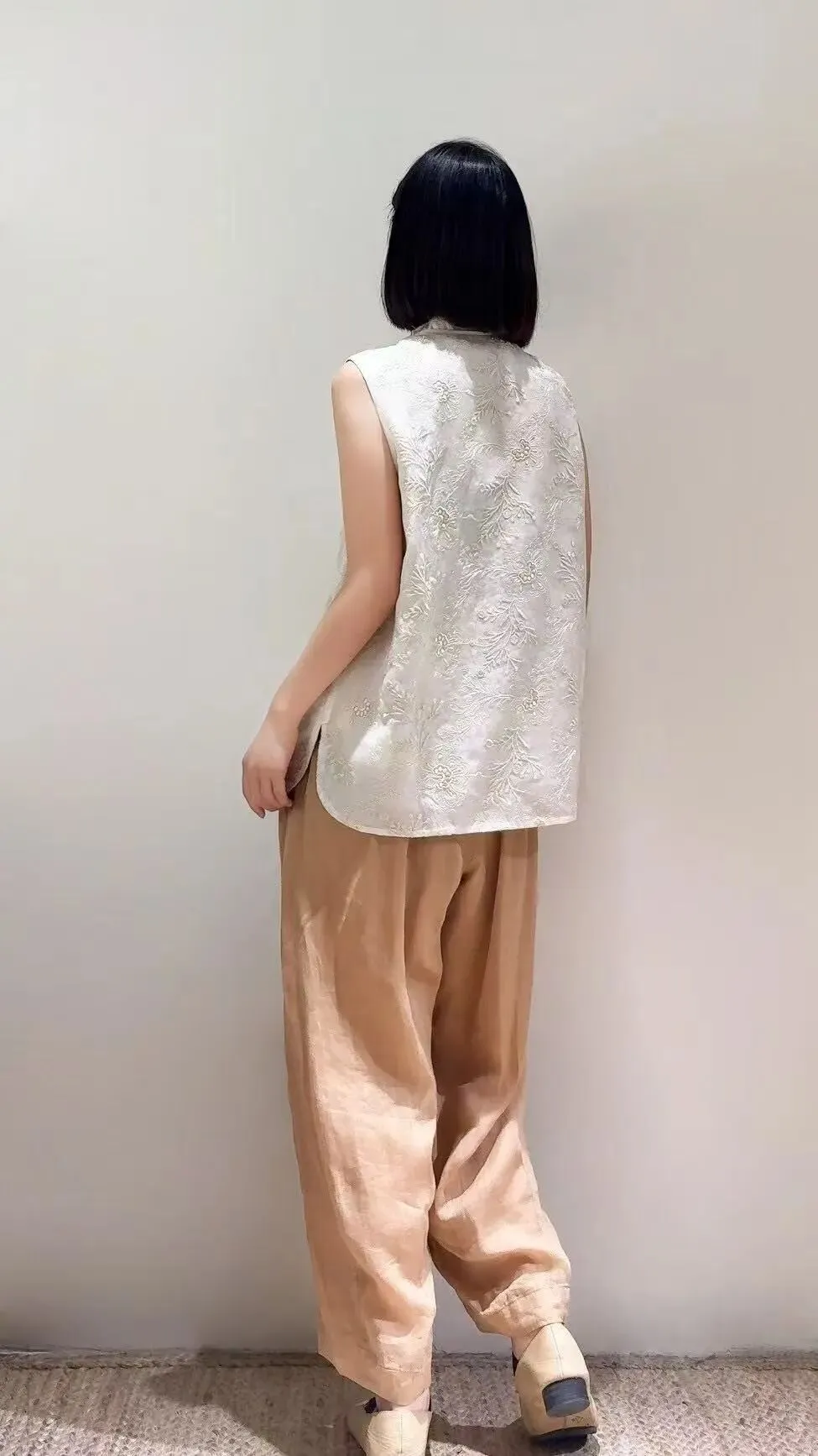 提花马甲以珍珠盘扣为引,暗纹刺绣藏着东方肌理