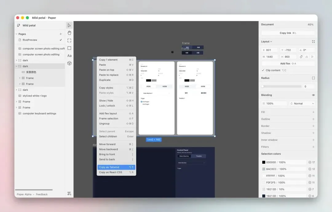 看到 Paper 可以直接复制 TailwindCSS 和 ReactCSS 代码,所以我尝试用 Paper 绘制了界面布局和风格。