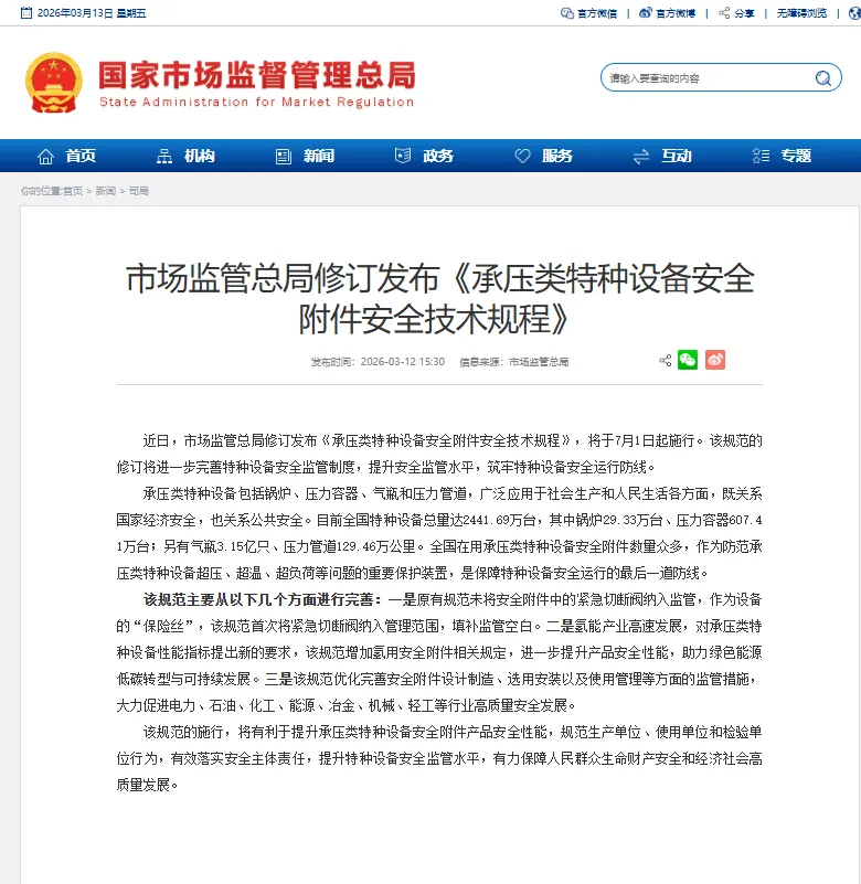 近日,市场监管总局修订发布《承压类特种设备安全附件安全技术规程》,将于7月1日起施行。该规范的修订将进一步完善特种设备安全监管制度,提升安全监管水平,筑牢特种设备安全运行防线。