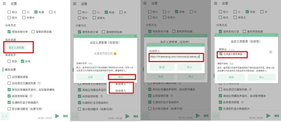 【设置】→【导入】→【在线导入】/【本地导入】→输入音乐地址→都选导入的音源