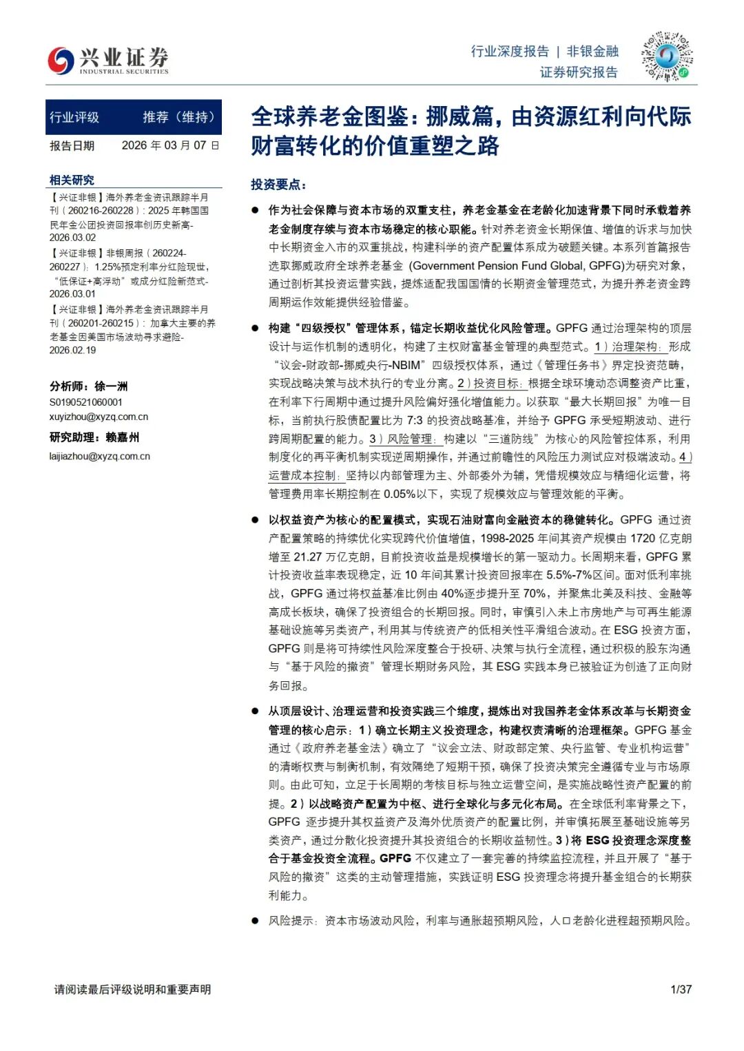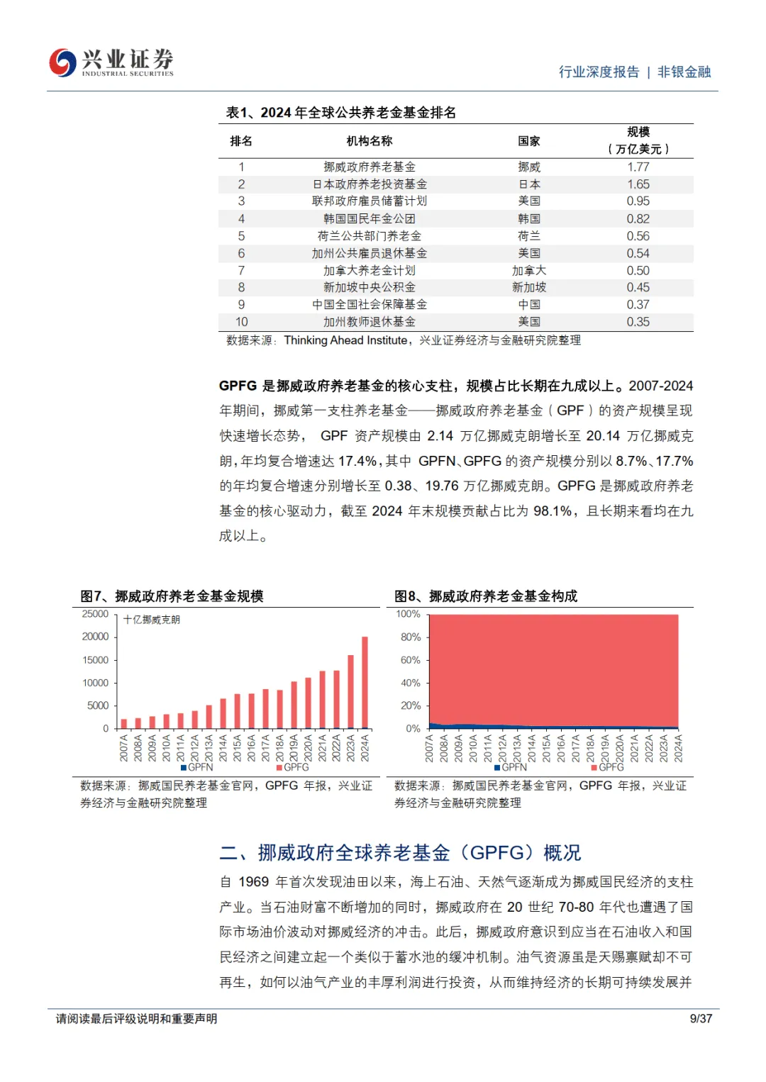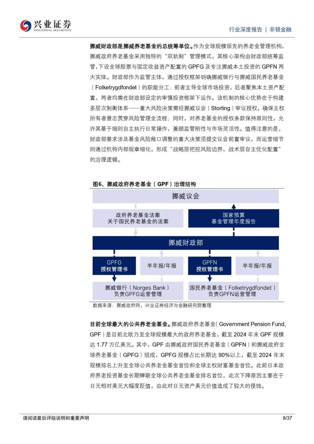 全球养老金图鉴:挪威篇,由资源红利向代际财富转化的价值重塑之路-兴业证券 报告聚焦全球规模最大的公共养老金基金 —— 挪威政府全球养老基金(GPFG),解析其从石油资源向代际财富转化的运作模式、资产配置与风险管理经验,为我国养老金体系改革提供借鉴。 ———— 全文获取见文末 需要下载完整版报告的朋友,可以扫下方优惠券付费成为会员,(现在加入仅需26/年)200000+份报告,随意下载,不受限制,(支持PC端/APP),星球保持每日更新。客服微信:SCBGK567 ↓微信扫码领优惠加入星球↓