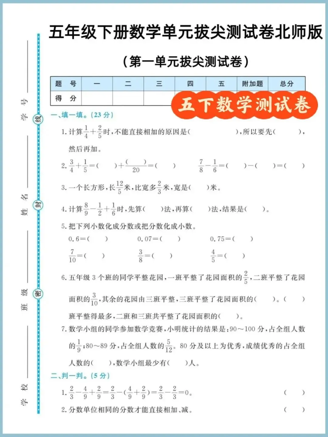 2025-2026学年北师大版五年级下册数学第一单元拔尖测试卷,(含答案)可下载打印