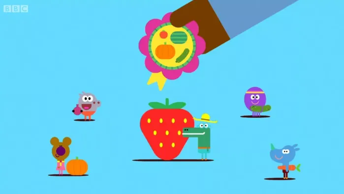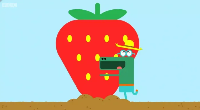 Duggee说和植物说说话可以帮助植物生长,于是小鳄鱼就不停地和它种下的草莓讲话,最后真的如愿收获了一只巨大的草莓