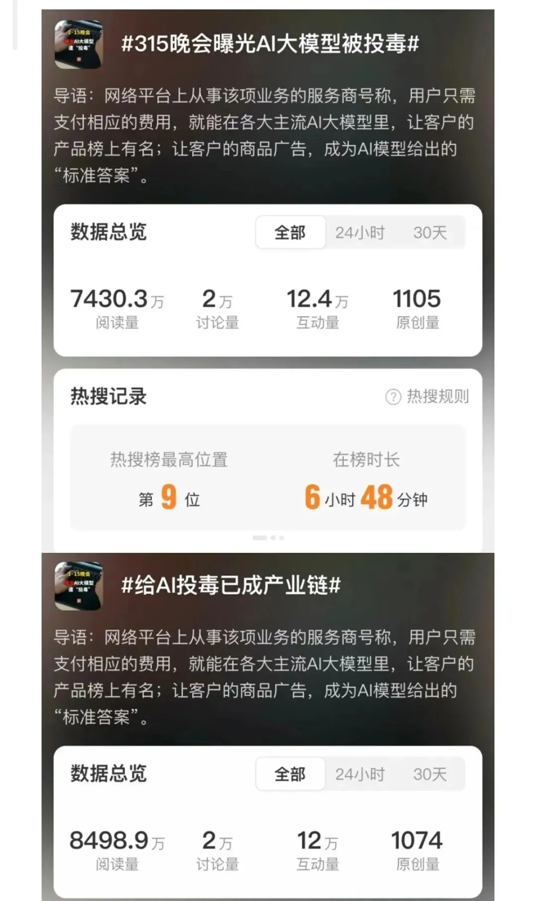 315爆光,“AI大模型被投毒”“给AI投毒已成产业链”等相关话题词条冲上热搜。
