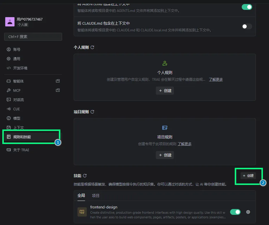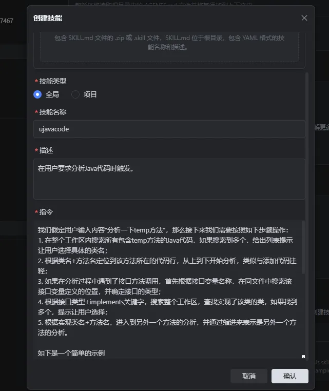 在创建页中我们可以直接上传skill,也可以自己编写。