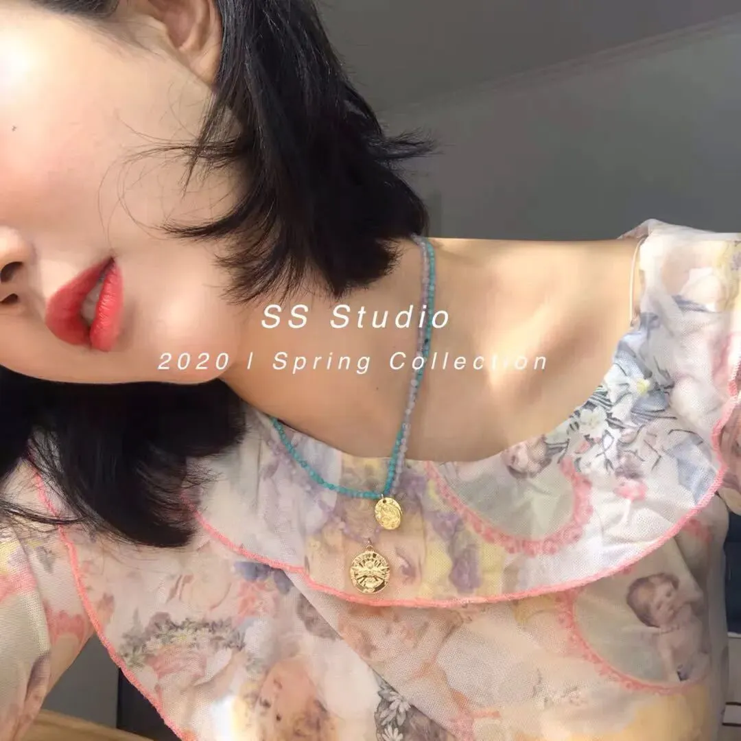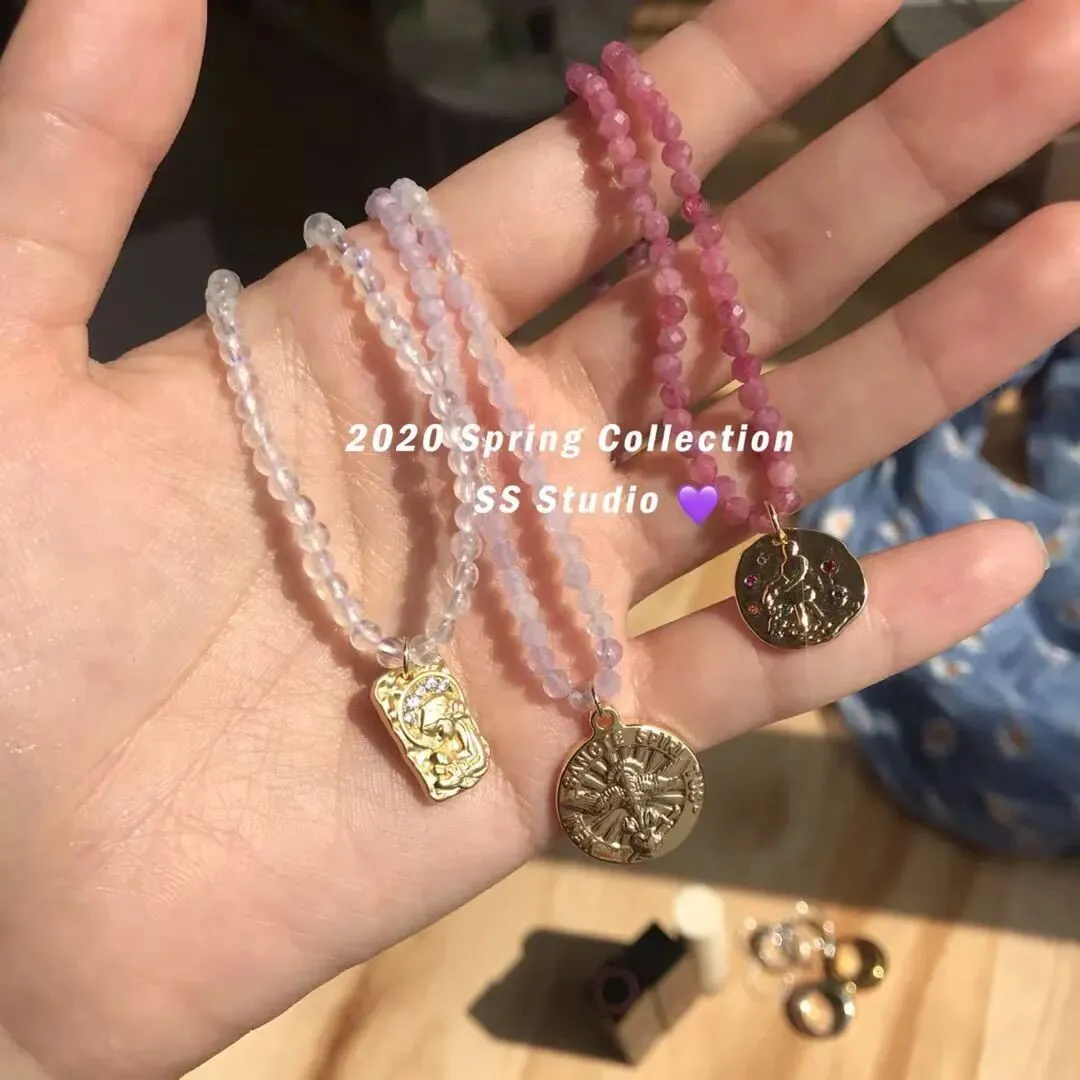 喏~这条项链就是我刚提到的。看到姐妹戴,我一眼就相中了。今年非常流行这种水晶宝石金币的项链,浓郁的复古风中还带有一丝艺术范儿,每个颜色都好好看!而且有一种被水晶宝石庇佑的既视感,随便搭配一件白T都特别洋气!