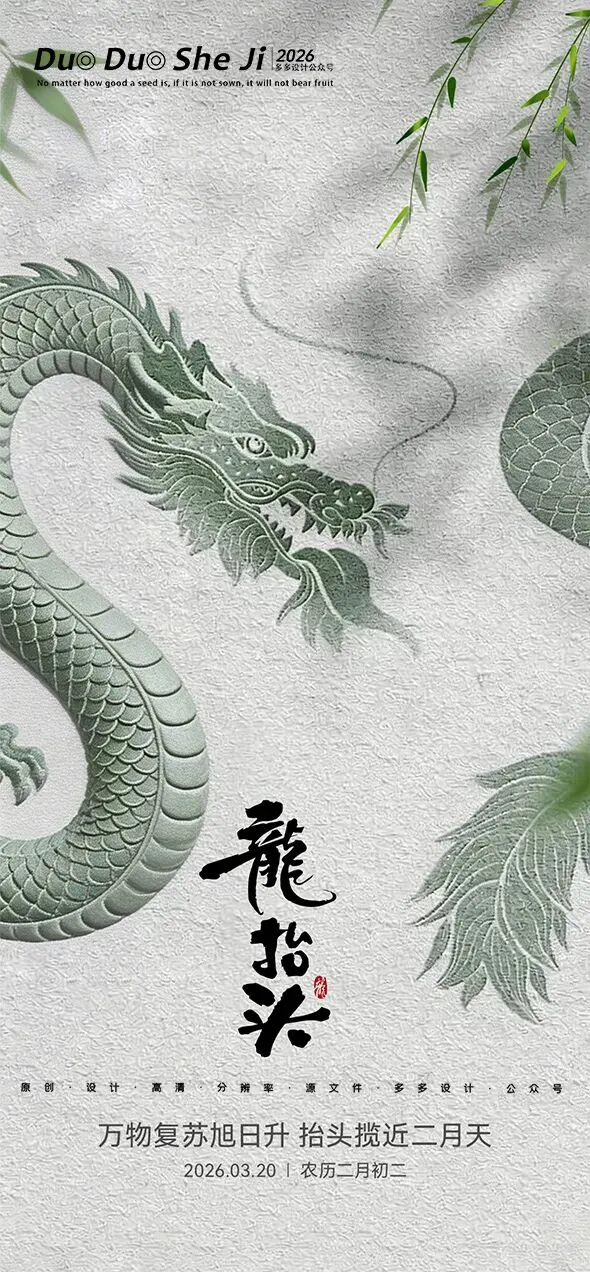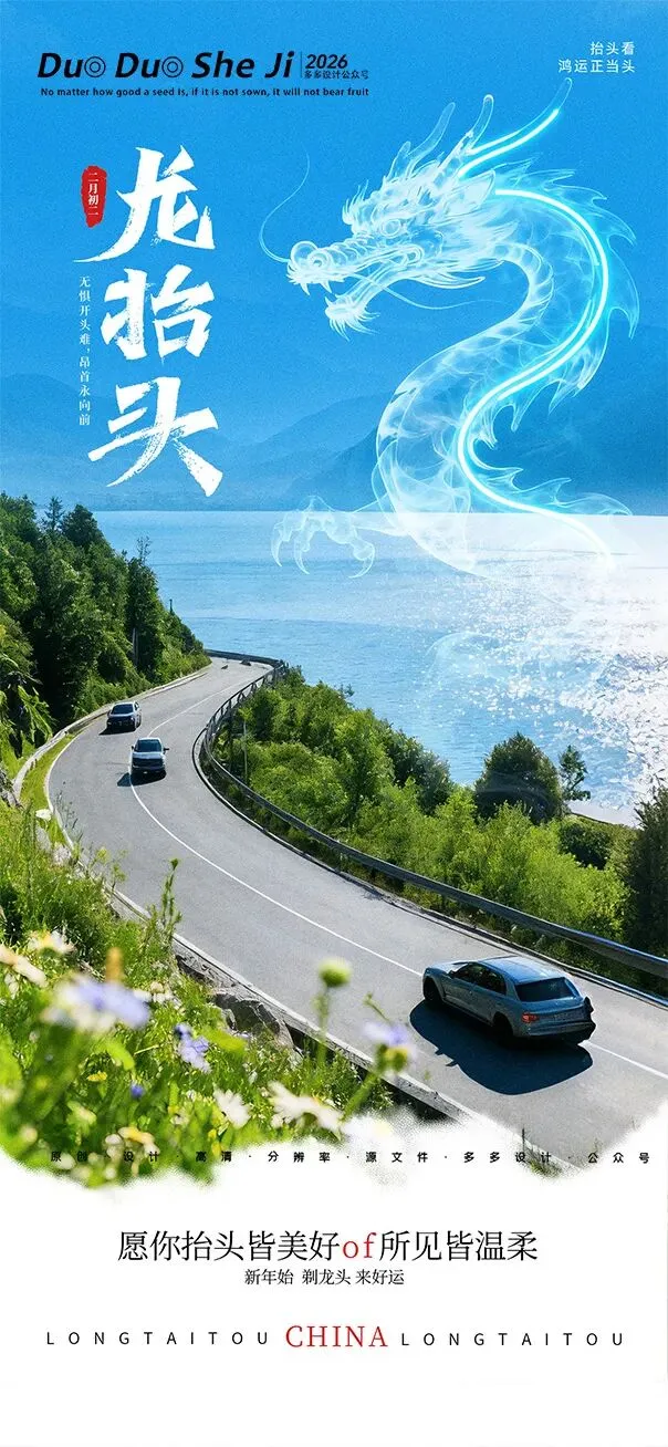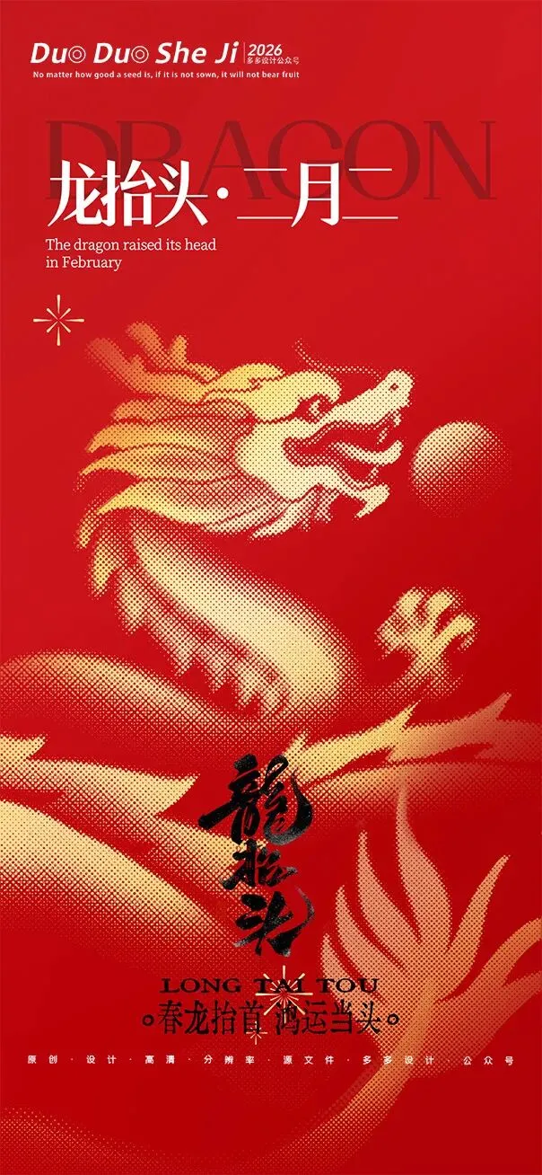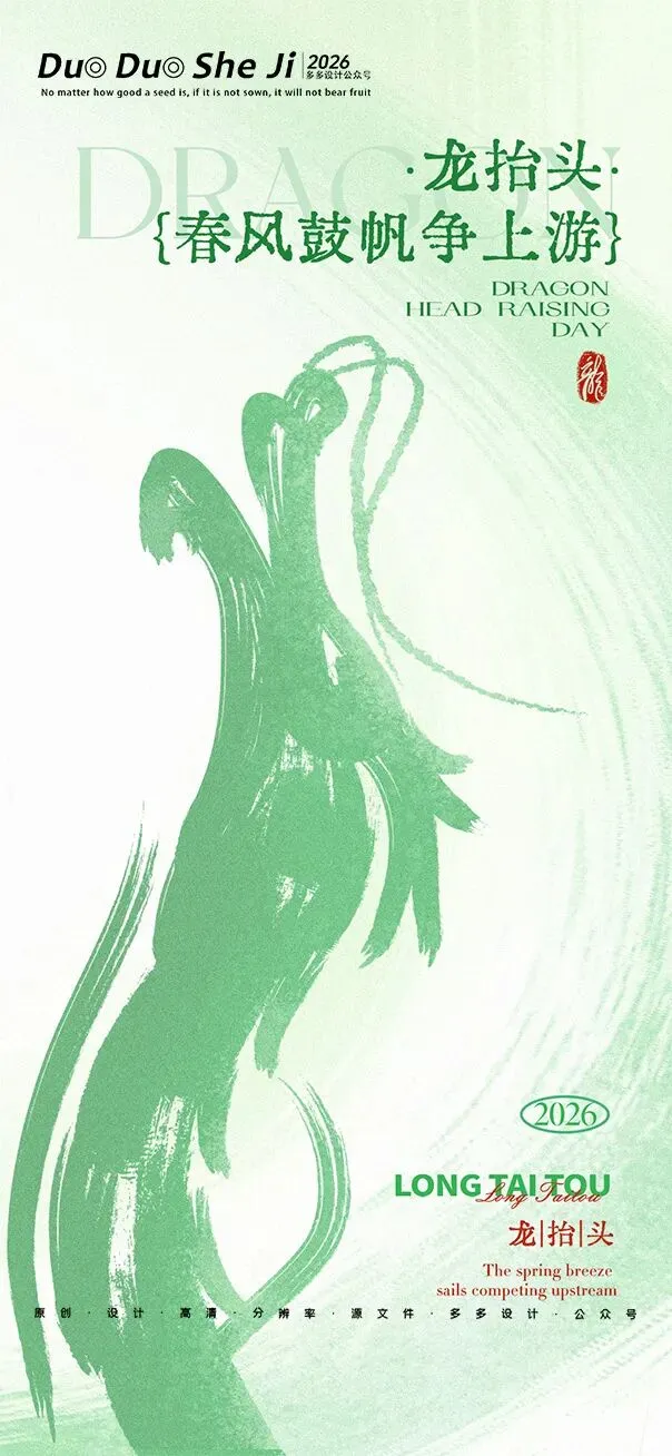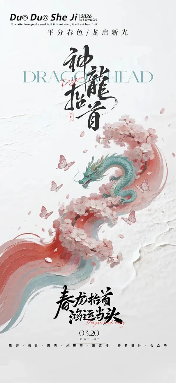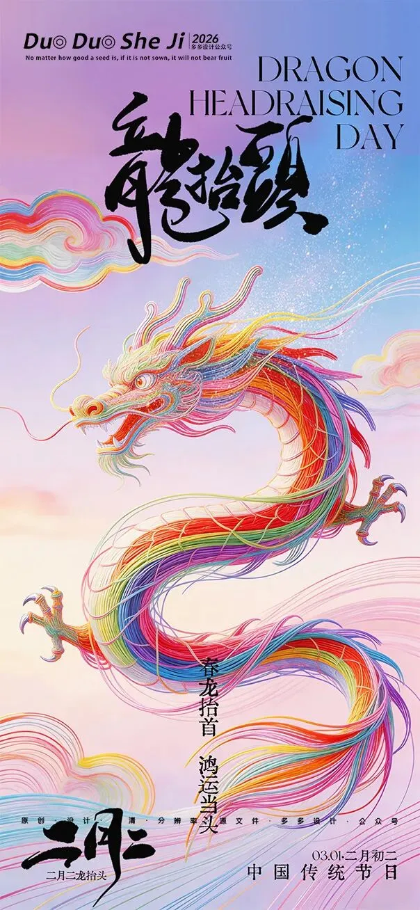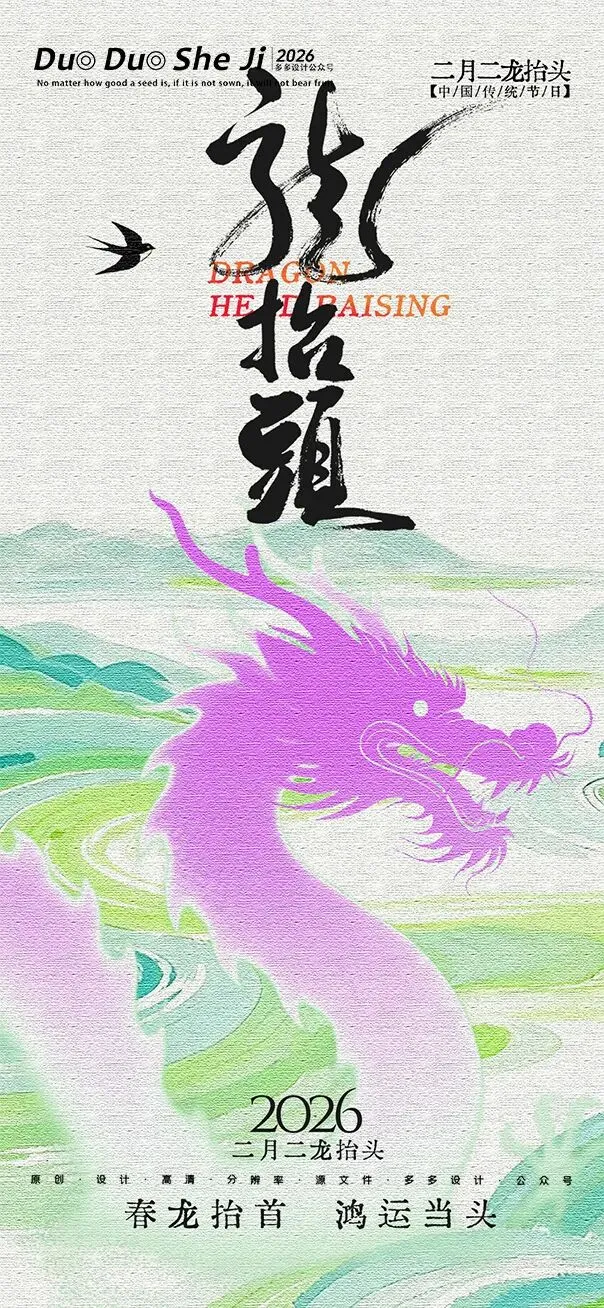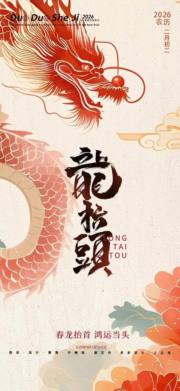 二月二,龙抬头,春意渐浓,万物复苏。在这个寓意吉祥的传统节日里,我们为大家准备了一组充满设计感的海报作品——既有传统民俗的韵味,又融入了现代创意的巧思。无论是腾云驾雾的祥龙,还是生机勃勃的春日元素,每一张海报都寄托着对美好生活的祈愿。快来收图吧,愿这份“抬头”的好兆头,带给您一整年的好运与灵感!🐉✨