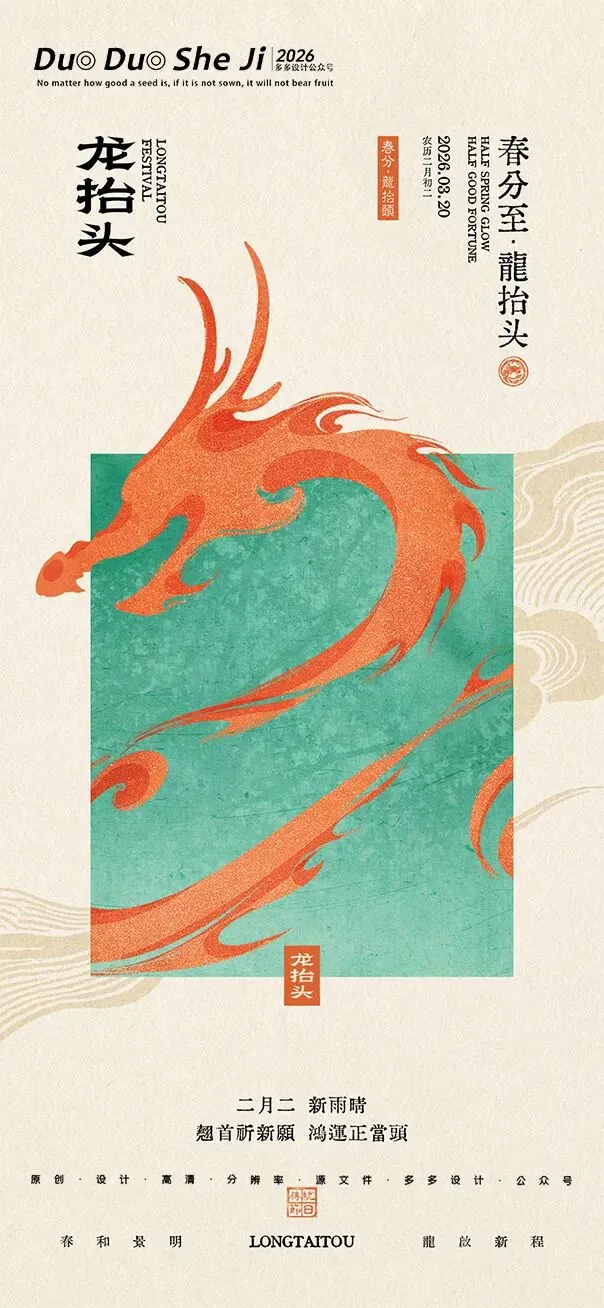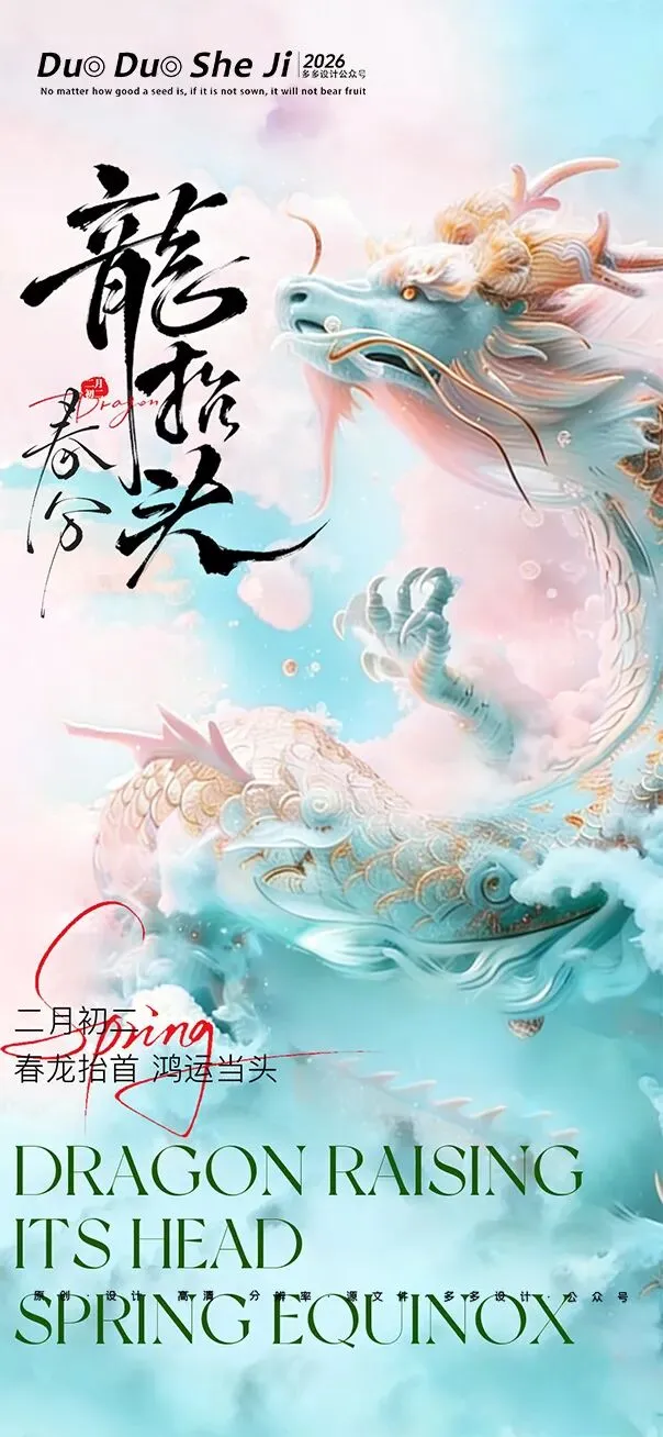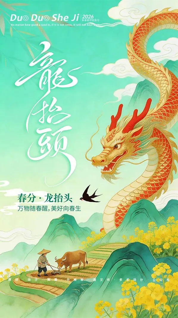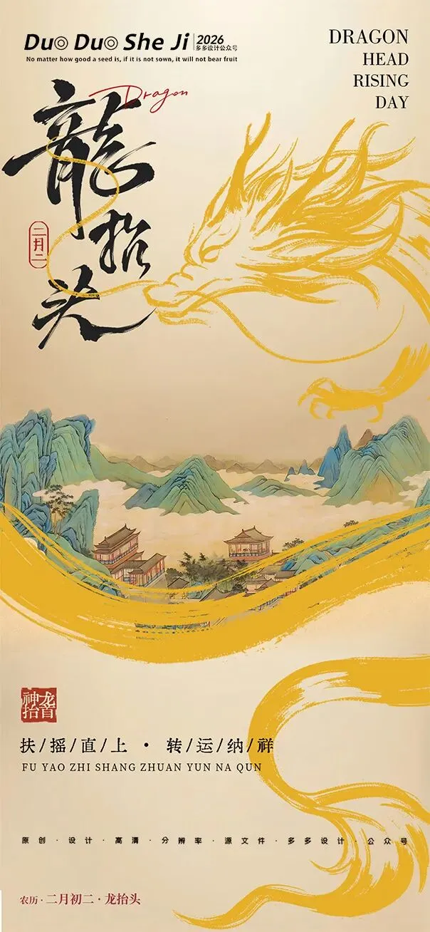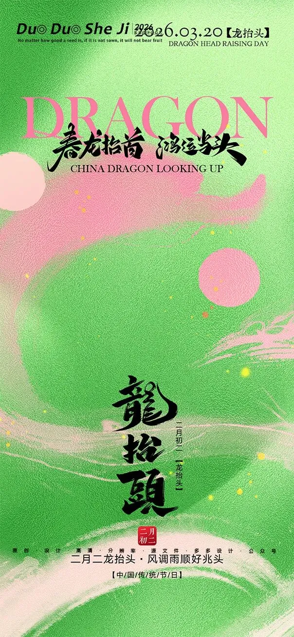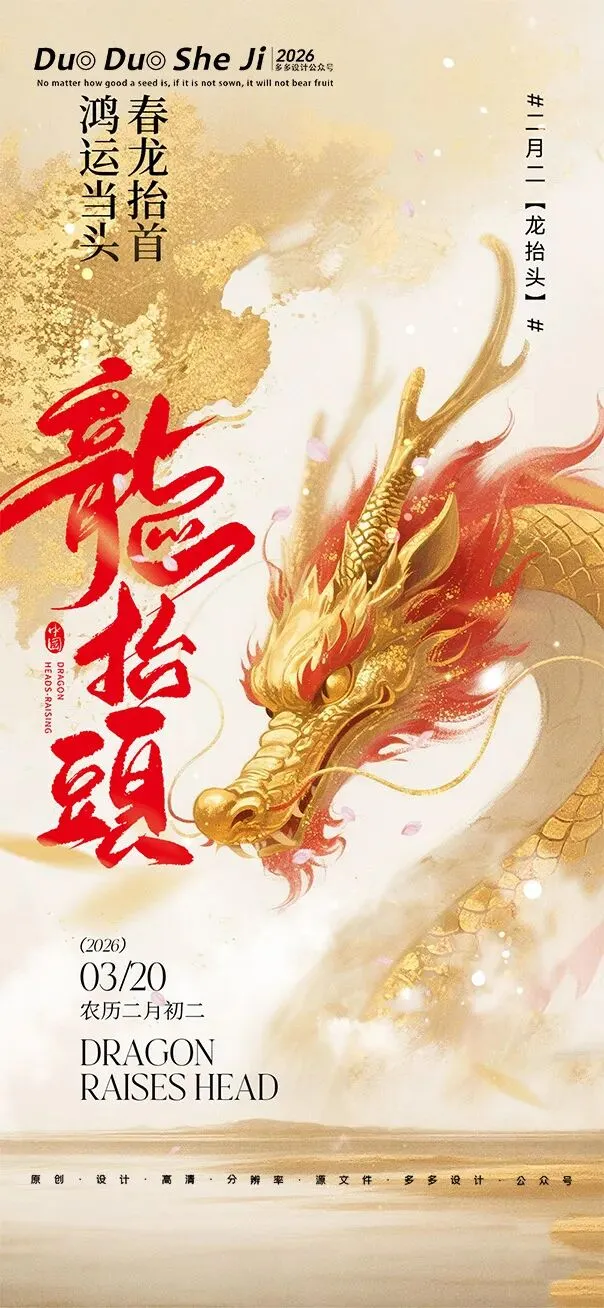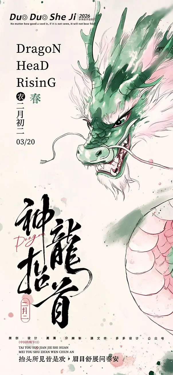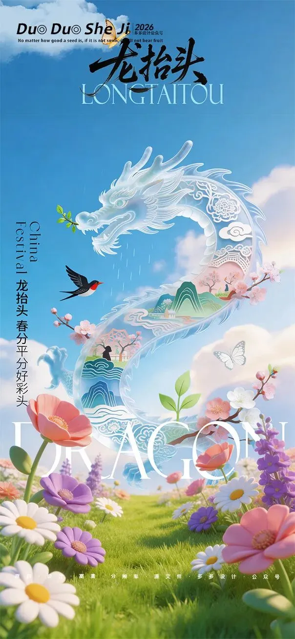 二月二,龙抬头,春意渐浓,万物复苏。在这个寓意吉祥的传统节日里,我们为大家准备了一组充满设计感的海报作品——既有传统民俗的韵味,又融入了现代创意的巧思。无论是腾云驾雾的祥龙,还是生机勃勃的春日元素,每一张海报都寄托着对美好生活的祈愿。快来收图吧,愿这份“抬头”的好兆头,带给您一整年的好运与灵感!🐉✨