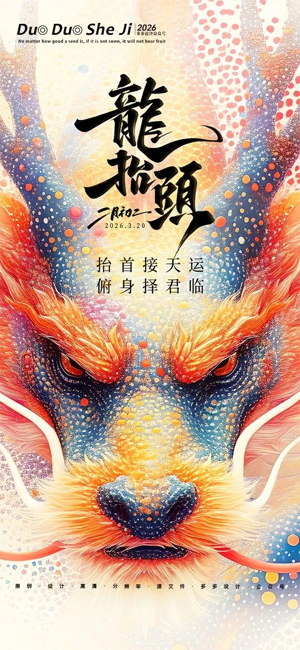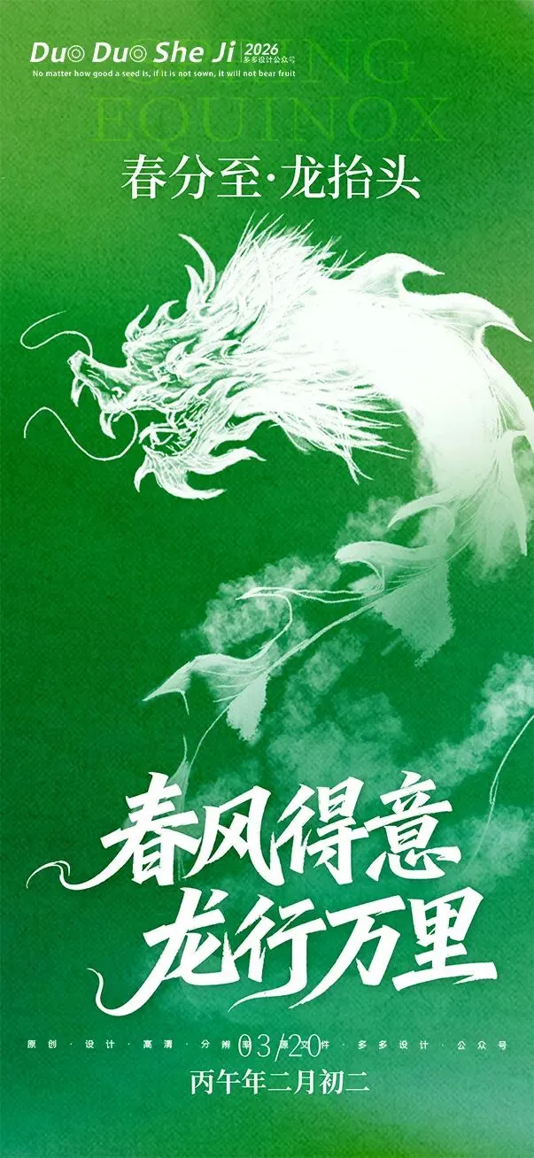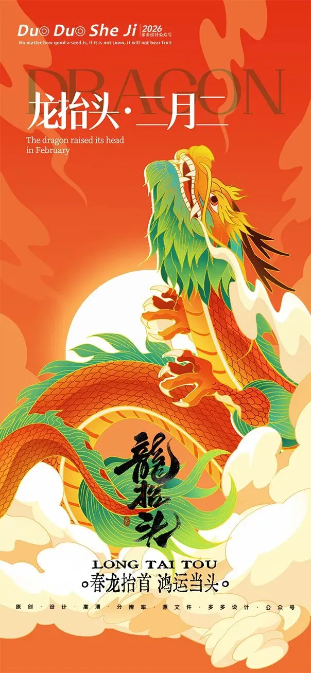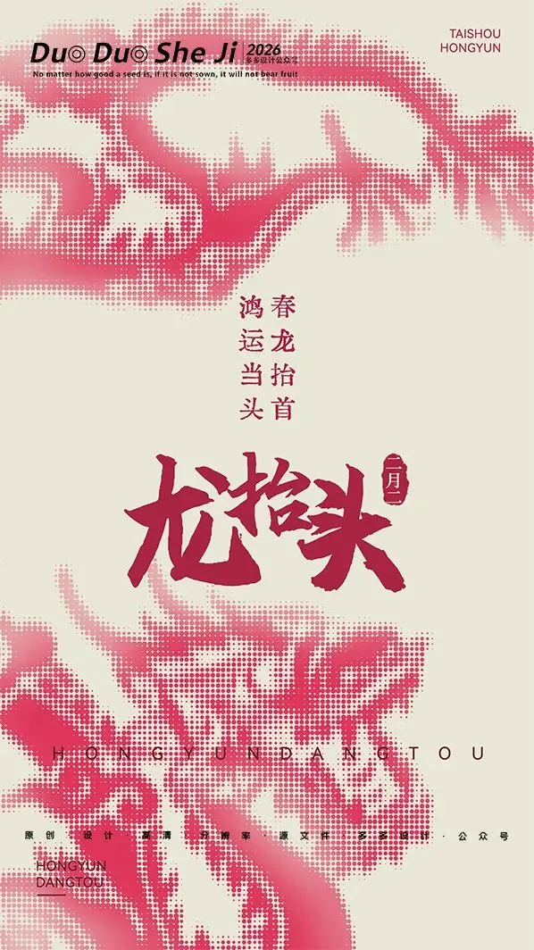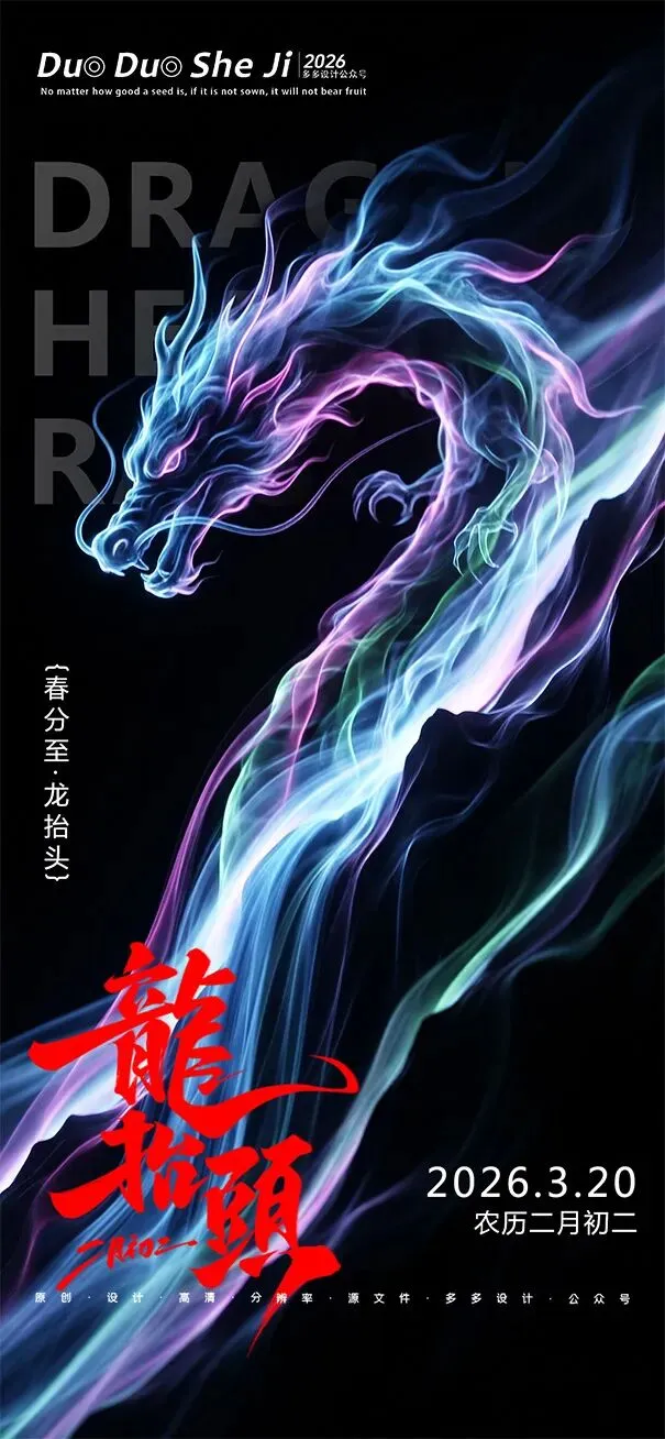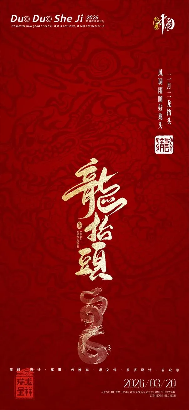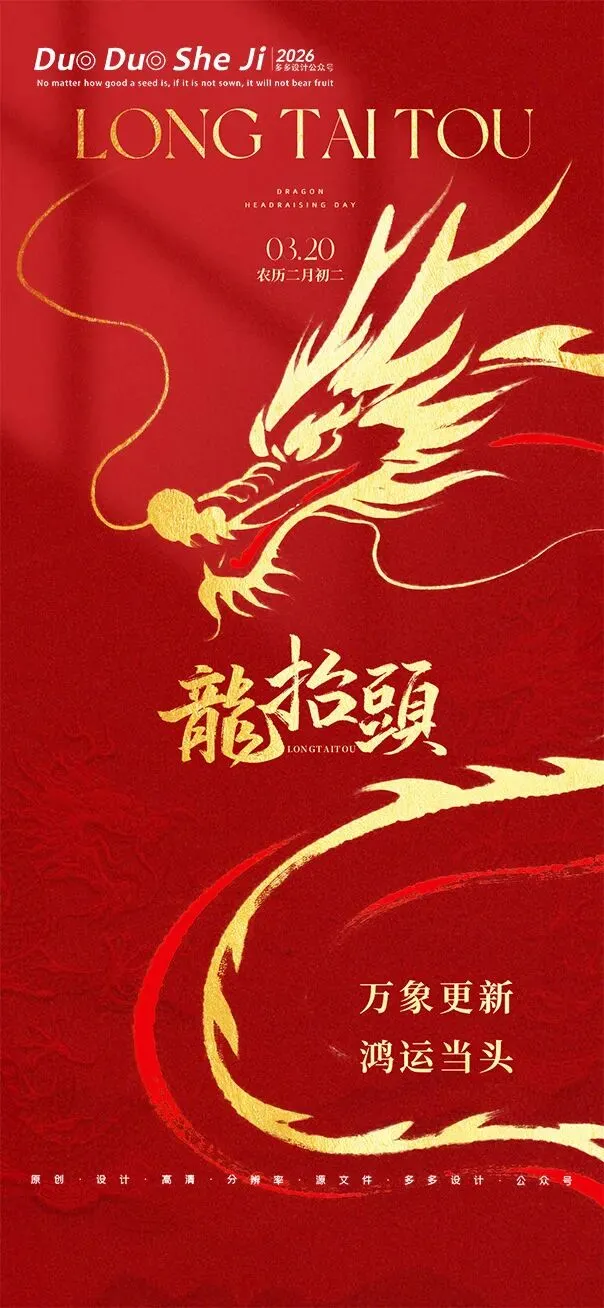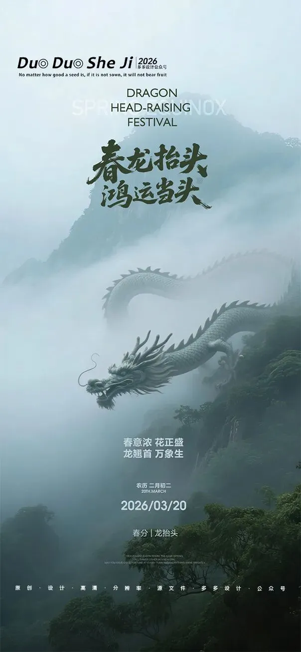 二月二,龙抬头,春意渐浓,万物复苏。在这个寓意吉祥的传统节日里,我们为大家准备了一组充满设计感的海报作品——既有传统民俗的韵味,又融入了现代创意的巧思。无论是腾云驾雾的祥龙,还是生机勃勃的春日元素,每一张海报都寄托着对美好生活的祈愿。快来收图吧,愿这份“抬头”的好兆头,带给您一整年的好运与灵感!🐉✨