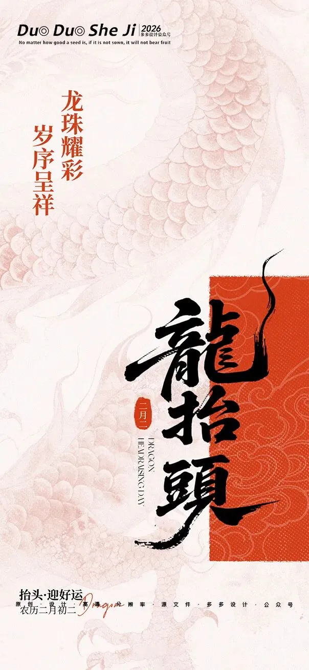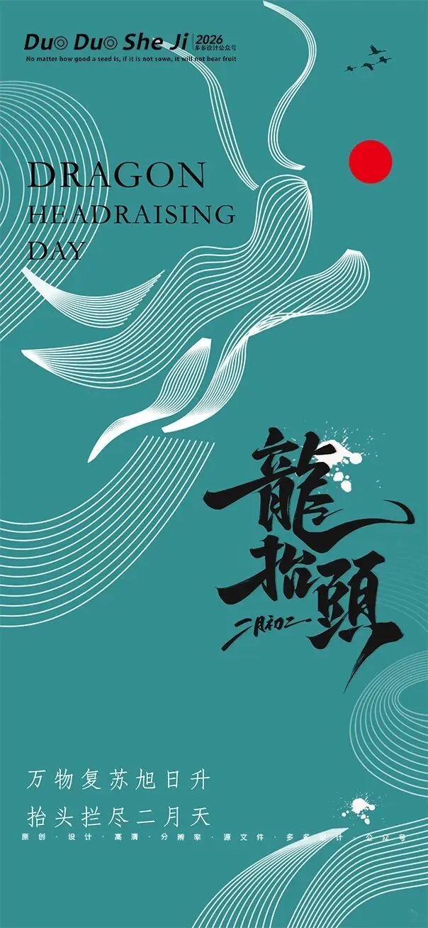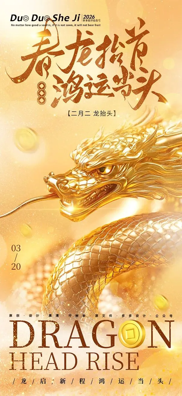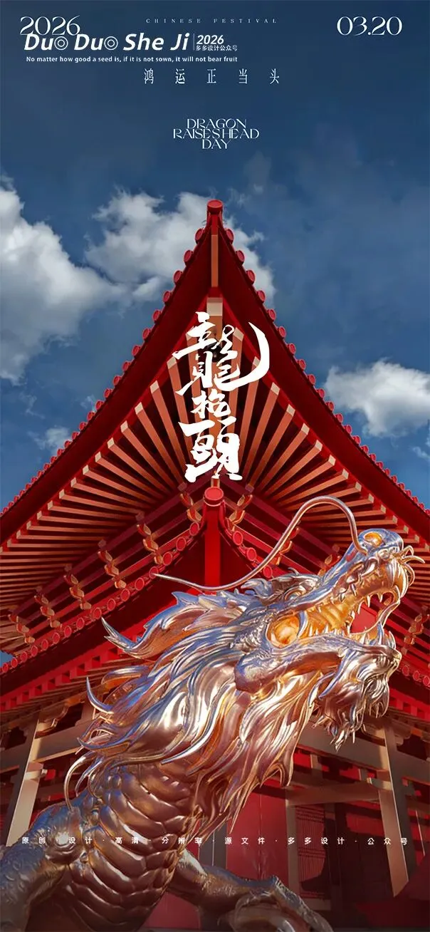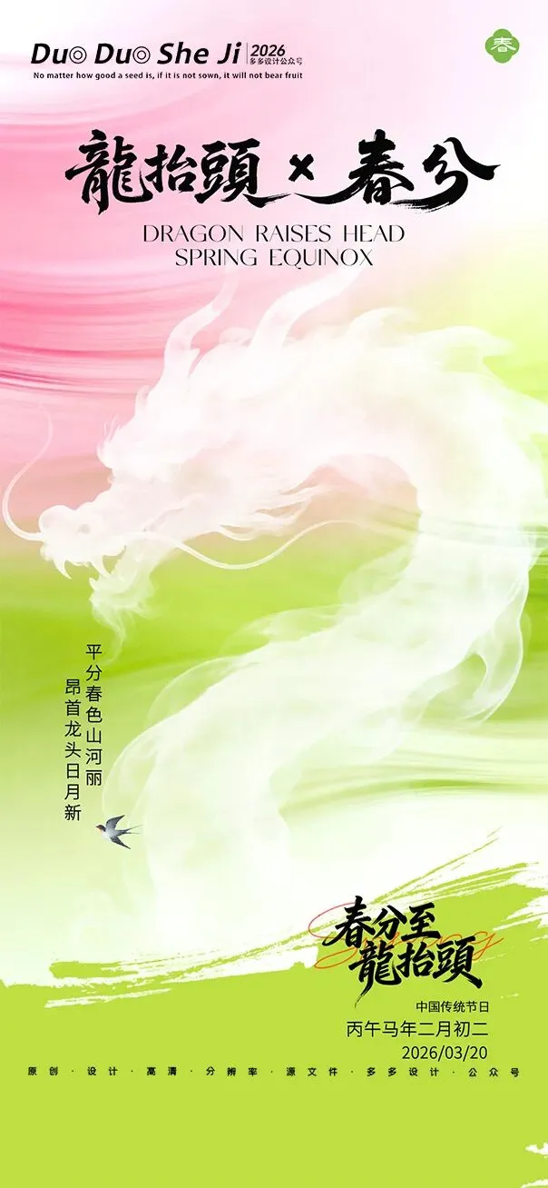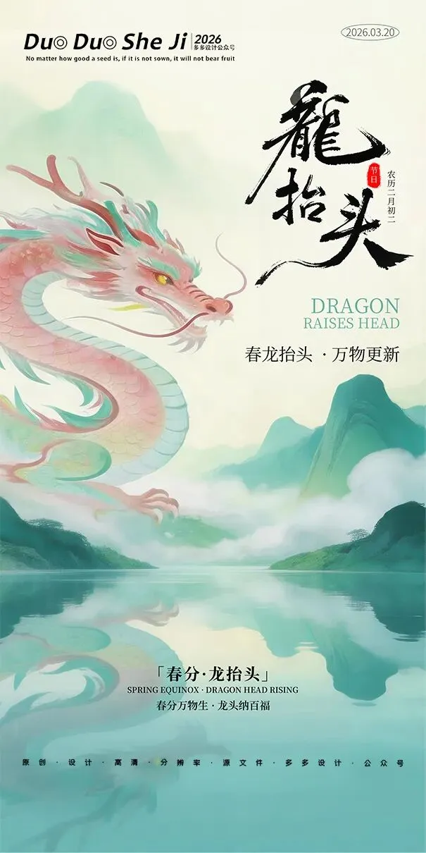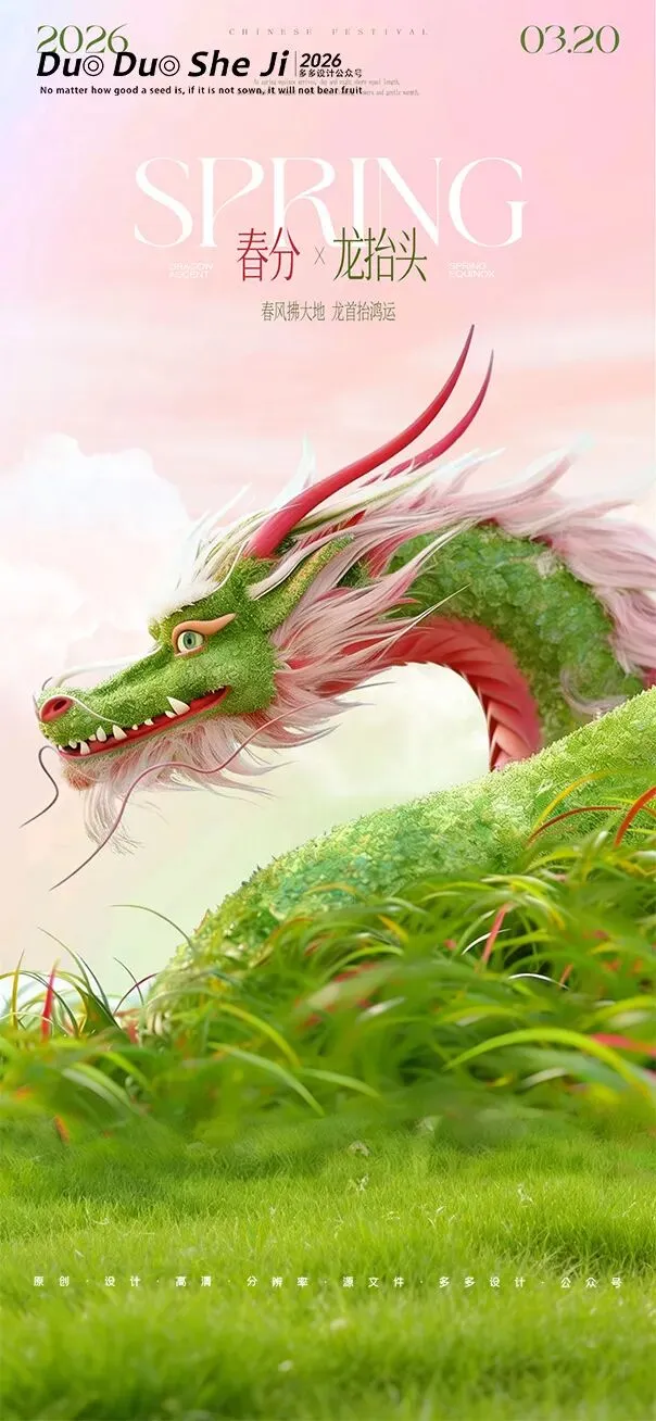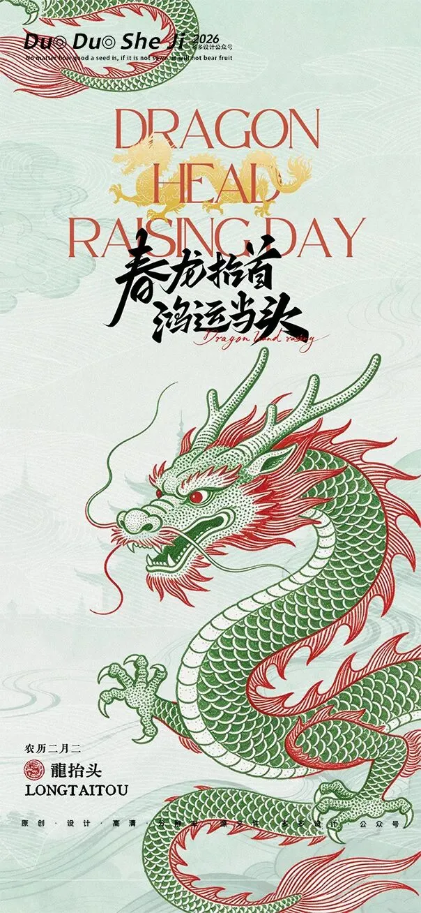 二月二,龙抬头,春意渐浓,万物复苏。在这个寓意吉祥的传统节日里,我们为大家准备了一组充满设计感的海报作品——既有传统民俗的韵味,又融入了现代创意的巧思。无论是腾云驾雾的祥龙,还是生机勃勃的春日元素,每一张海报都寄托着对美好生活的祈愿。快来收图吧,愿这份“抬头”的好兆头,带给您一整年的好运与灵感!🐉✨
