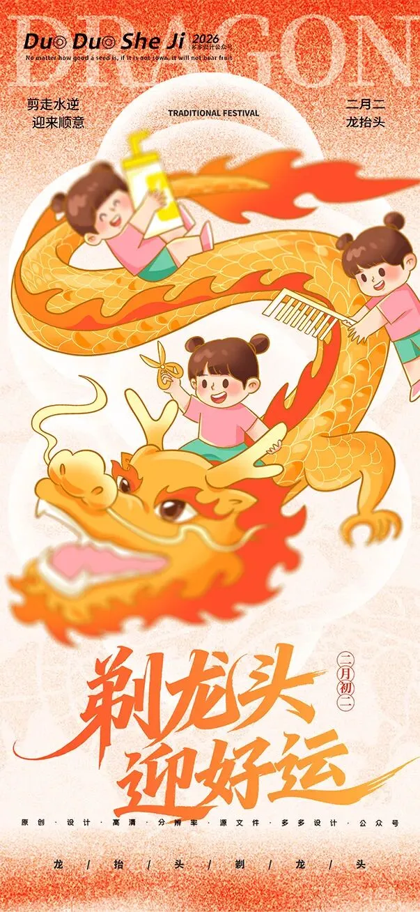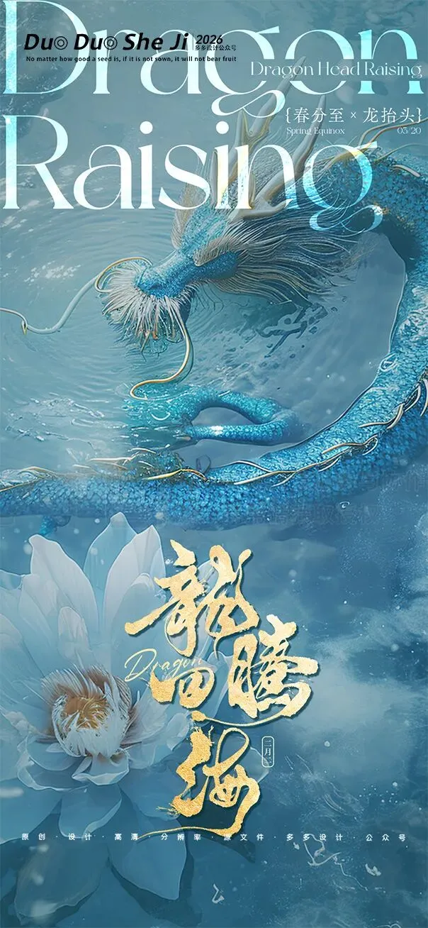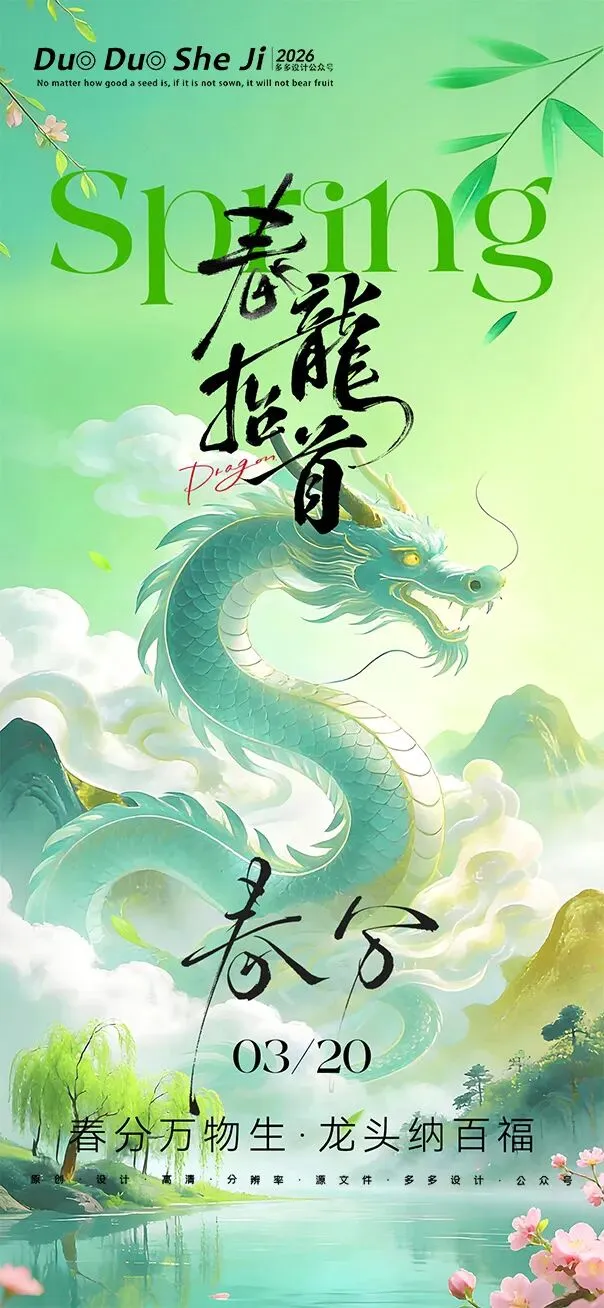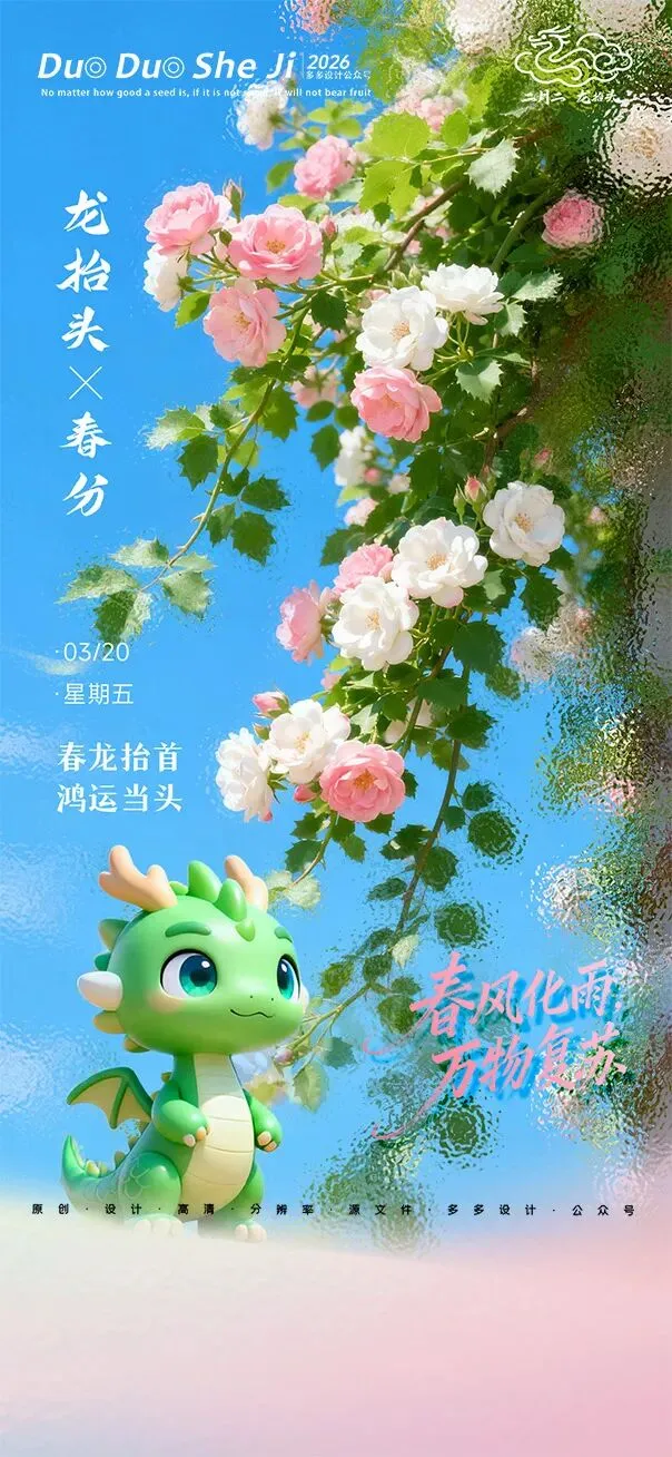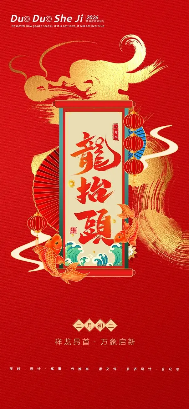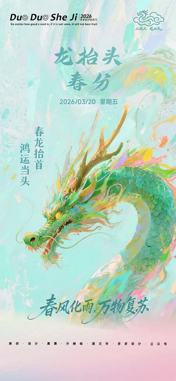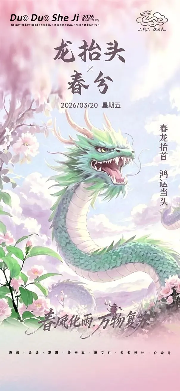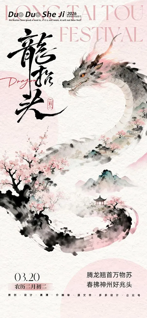 二月二,龙抬头,春意渐浓,万物复苏。在这个寓意吉祥的传统节日里,我们为大家准备了一组充满设计感的海报作品——既有传统民俗的韵味,又融入了现代创意的巧思。无论是腾云驾雾的祥龙,还是生机勃勃的春日元素,每一张海报都寄托着对美好生活的祈愿。快来收图吧,愿这份“抬头”的好兆头,带给您一整年的好运与灵感!🐉✨