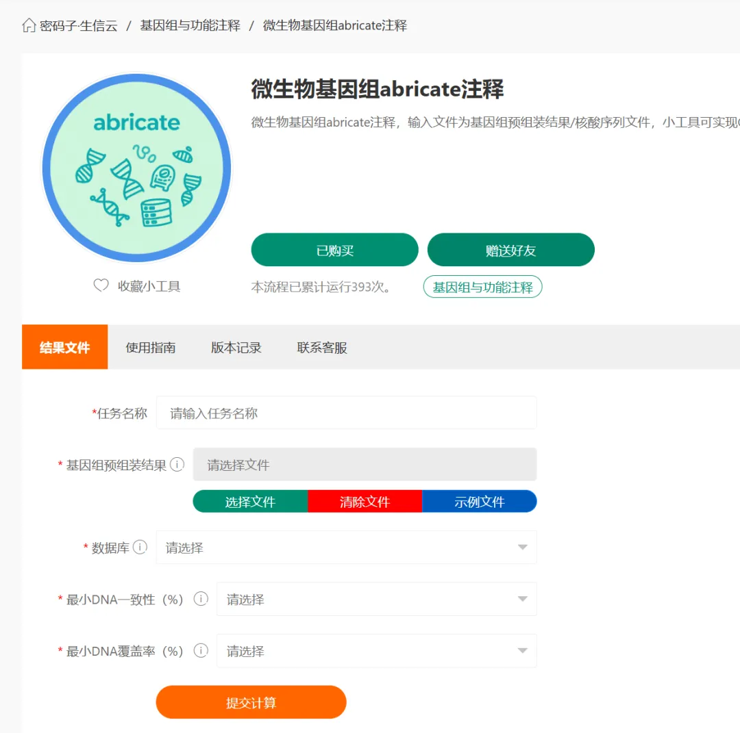 之前发布的文章《细菌耐药基因及毒力基因分析实战-ABRicate安装及使用指南》以及我们的课程《微生物抗性与毒力基因注释:ABRicate软件全能实战》(https://college.mimazi.net/course/article-66.html),详细讲解了ABRicate的本地安装与实操技巧。为帮助大家摆脱软件安装和环境配置的繁琐,上海唯那生物现已推出生信云平台服务,将ABRicate注释流程全面云化,实现“零代码、点选式”操作。