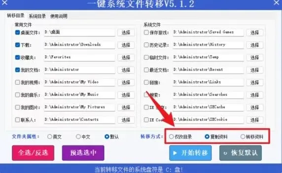 一键系统文件转移 主要就是把 Windows 里一些常用的系统文件夹,直接转移到 非系统盘。