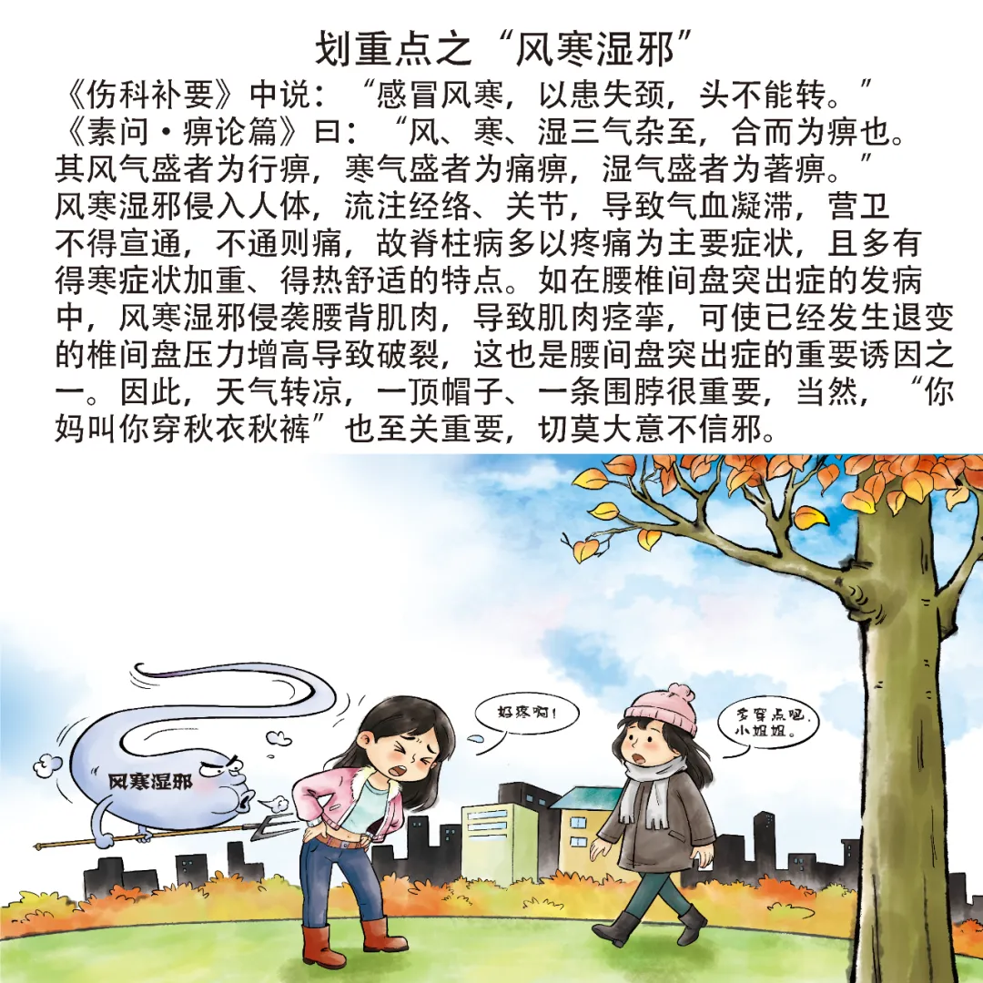 风寒湿邪侵入人体,流注经络、关节,导致气血凝滞,营卫不得宣通,不通则痛,故脊柱病多以疼痛为主要症状,且多有得寒症状加重、得热舒适的特点。如在腰椎间盘突出症的发病中,风寒湿邪侵袭腰背肌肉,导致肌肉痉挛,可使已经发生退变的椎间盘压力增高导致破裂,这也是腰间盘突出症的重要诱因之一。因此,天气转凉,一顶帽子、一条围脖很重要,当然,“你妈叫你穿秋衣秋裤”也至关重要,切莫大意不信邪。