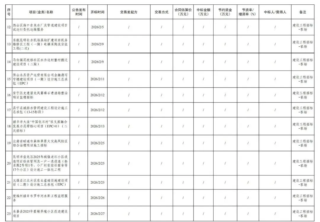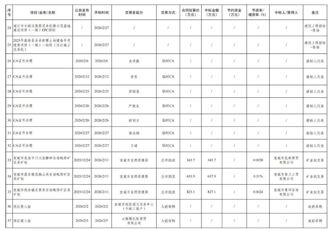 2026年2月,宣威市公共资源交易中心共完成项目全流程电子化进场交易28宗,其中:本地项目交易10宗、成交额10518.85万元,远程异地项目客场交易18宗。本地项目进场交易预算价10611.60万元,中标价10518.85万元,累计节约资金98.75万元,增加资金6.00万元,其中:建设工程交易7宗,预算价8806.93万元、中标价8708.18万元,节约资金98.75万元、节资率1.12%;矿业权交易3宗,起拍价1804.67万元,成交价1810.67万元,增值6.00万元,增资率0.33%。本月综合交易、政府采购、国有土地使用权、国有产权领域均无交易项目。