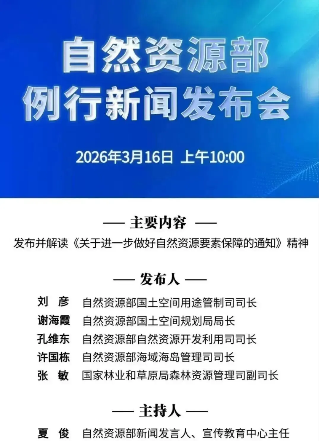 [自然资源部新闻发言人、宣教中心主任夏俊]各位媒体朋友,大家上午好!欢迎参加自然资源部3月例行新闻发布会。感谢各位长期以来对自然资源工作的关心支持!