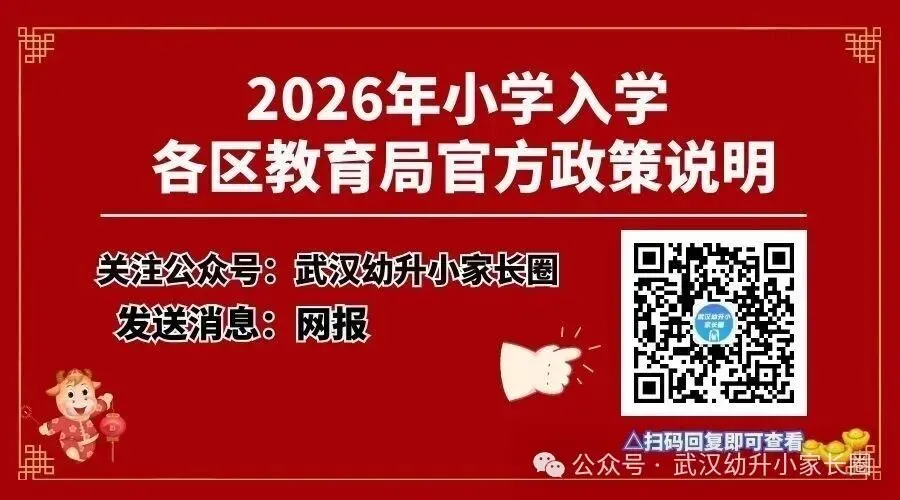 2026年各区武汉幼升小小学入学官方说明出炉! 扫码即可加入2026幼升小交流群 各区政策出炉汇第一时间发布哟, 辛苦大家随时回复查看! 也欢迎到群里沟通交流! 武汉各区2026年网报政策 网报流程 时间与资料 目前已出炉2026年武汉各区小学入学政策情况如下 事关孩子上学!市教育局发布 2026 年中小学新生招生工作安排!(网报时间+详细时间节点) 2026年义务教育武汉小学入学网报公办小学报名保姆级攻略! 2026年江岸区小学新生入学网上信息登记公告 2026年武昌区小学新生入学操作攻略 2026年江汉区小学新生入学指南 小学新生登记网报怎么报?洪山区官方指南来了 武汉经开区2026年秋季小学一年级新生入学信息登记公告 2026年蔡甸区小学新生入学招生工作指南 2026年黄陂区小学新生入学登记公告 新洲区2026年小学新生入学指南 扫码即可加入各区幼升小交流群 扫码加入👇 扫码即可加入2026幼升小交流群 推荐阅读 武汉上小学网报全流程+步骤+常见问题一文看懂! 2026年武汉幼升小小学入学网报时间 2026 武汉幼升小必看!14 区网报材料,户籍房产别备错 武汉幼升小家长注意!3 月网报启动,时间节点错了直接后悔 武汉幼升小4次择校机会,一文理清!公办+民办全覆盖,家长直接收藏 这些小学1年级开始就学英语了!汉阳的是怎么回事? 2026武汉幼升小:小学入学出现这几种情况,这些情形一律统筹入学! 给2026年一年级新同学的入学准备清单