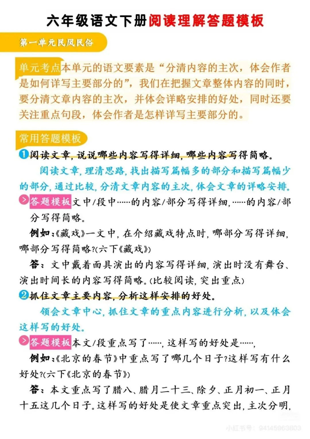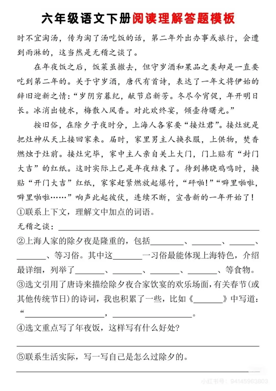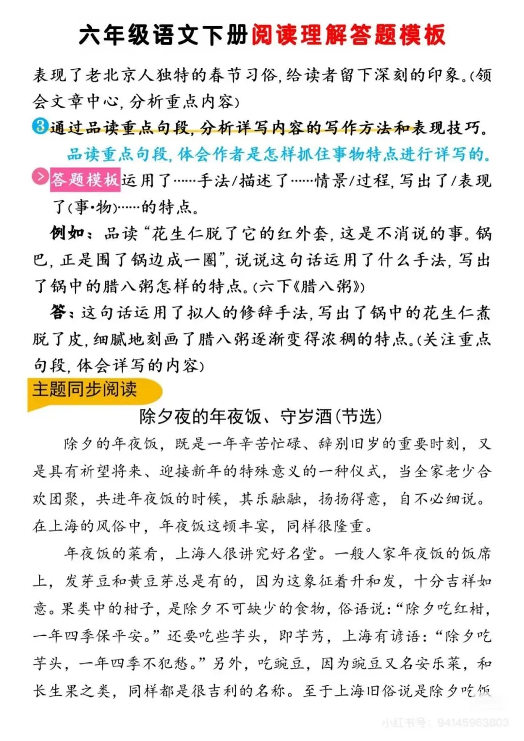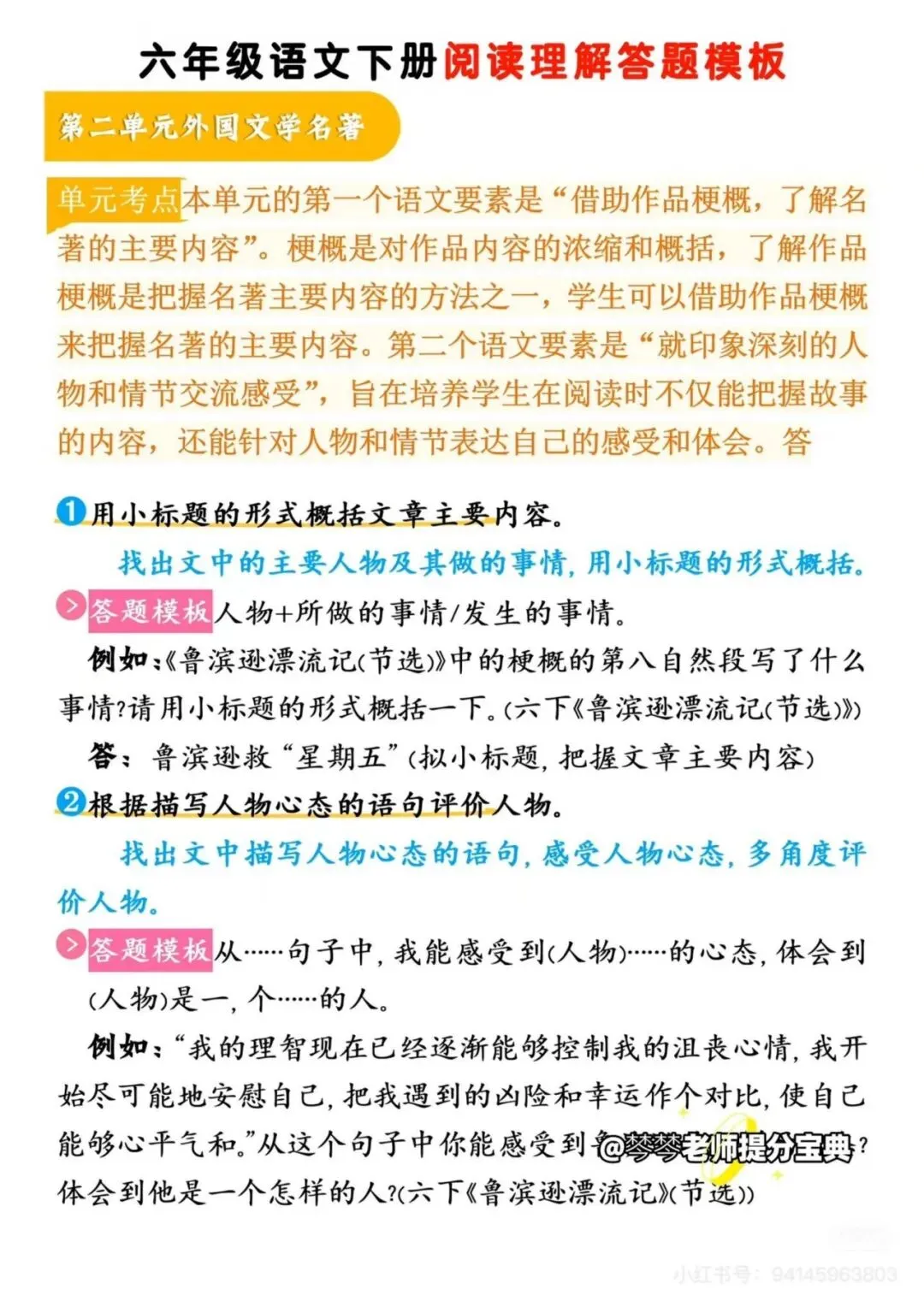 六年级下册语文【阅读理解答题模板】PDF电子版可下载