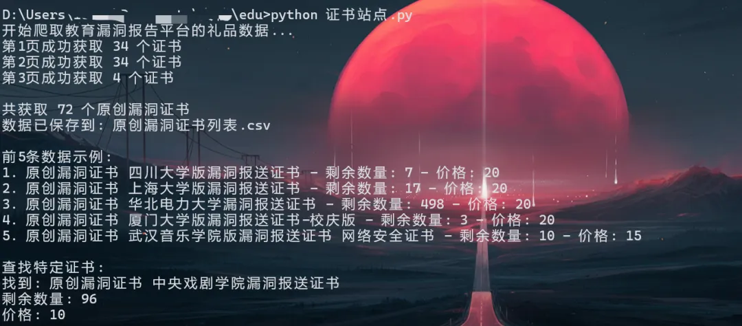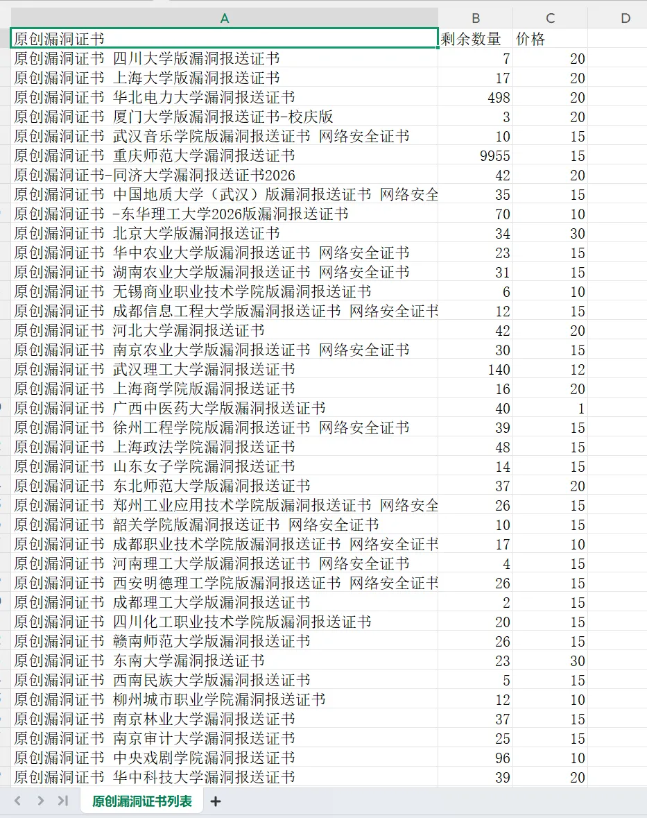 # 添加查询参数params = {'page': page_num}try:response = requests.get(base_url, headers=headers, params=params, timeout=10)response.raise_for_status()response.encoding = 'utf-8'soup = BeautifulSoup(response.text, 'html.parser')gift_items = []# 查找所有礼品项thumbnails = soup.find('ul', class_='am-avg-sm-4 am-thumbnails')if thumbnails:li_items = thumbnails.find_all('li')for li in li_items:# 提取证书名称name_link = li.find('a', href=lambda x: x and '/gift/' in x)if name_link and '原创漏洞证书' in name_link.text:cert_name = name_link.text.strip()# 提取剩余数量quantity_p = li.find('p', string=lambda x: x and '剩余数量:' in x)quantity = quantity_p.text.replace('剩余数量:', '').strip() if quantity_p else 'N/A'# 提取价格price_p = li.find('p', string=lambda x: x and '价格:' in x)price = price_p.text.replace('价格:', '').strip() if price_p else 'N/A'gift_items.append({'原创漏洞证书': cert_name,'剩余数量': quantity,'价格': price})print(f"第{page_num}页成功获取 {len(gift_items)} 个证书")return gift_items