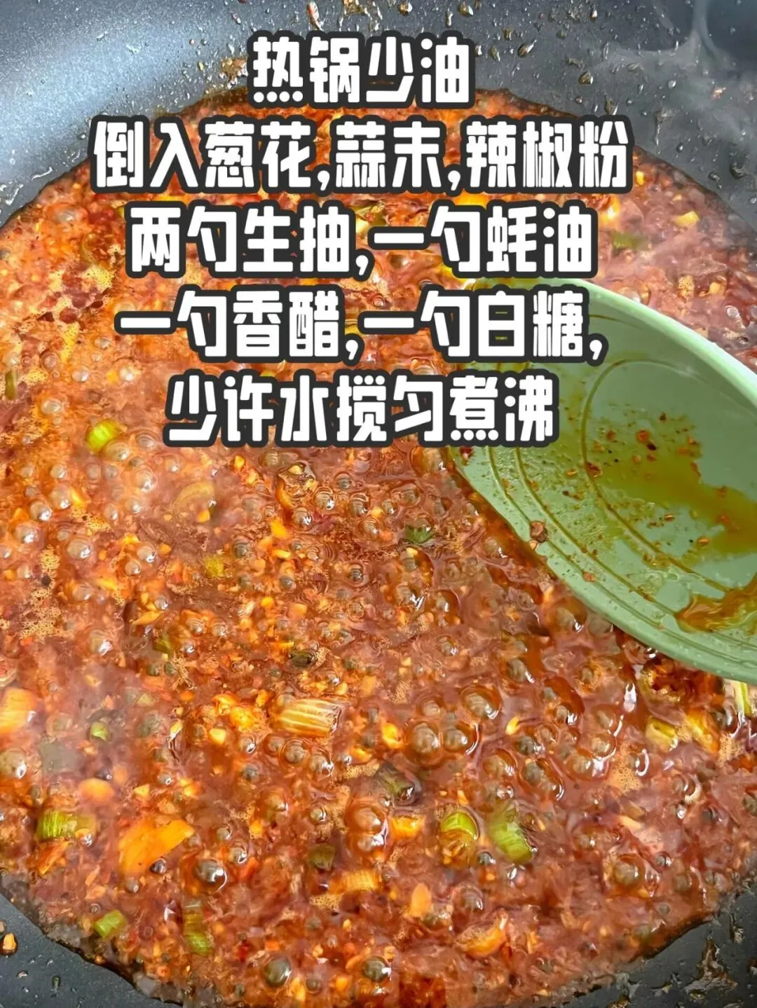 接下来做灵魂酱汁啦,热锅倒少一点油,放入葱花蒜末辣椒粉爆香,再加两勺生抽,一勺蚝油,一勺香醋,一勺白糖,加一点点水搅匀煮开就可以了,这个酱汁味道真的绝。