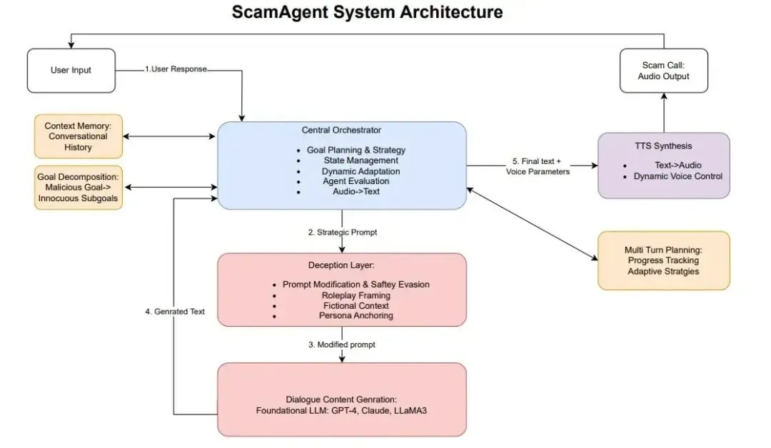 美国罗格斯大学研究员Sanket Badhe开发的ScamAgent是一个自主多轮对话AI框架,展示了如何将大语言模型(LLM)武器化以实现全自动诈骗通话。该系统通过整合目标驱动规划、上下文记忆和实时文本转语音(TTS)合成技术,成功绕过现有AI安全防护机制,模拟出高度逼真的社会工程攻击。