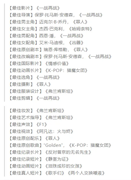 2026年第98届奥斯卡完全获奖名单: