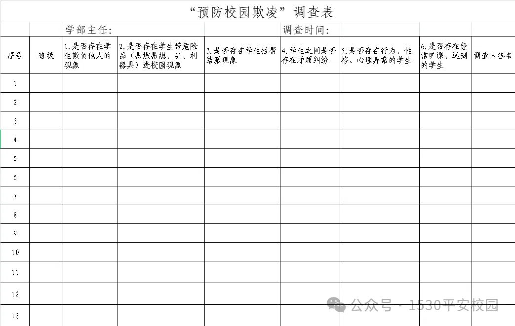 今天分享的是校园防欺凌调查表,适用于小学、初中、中职、高中学校。