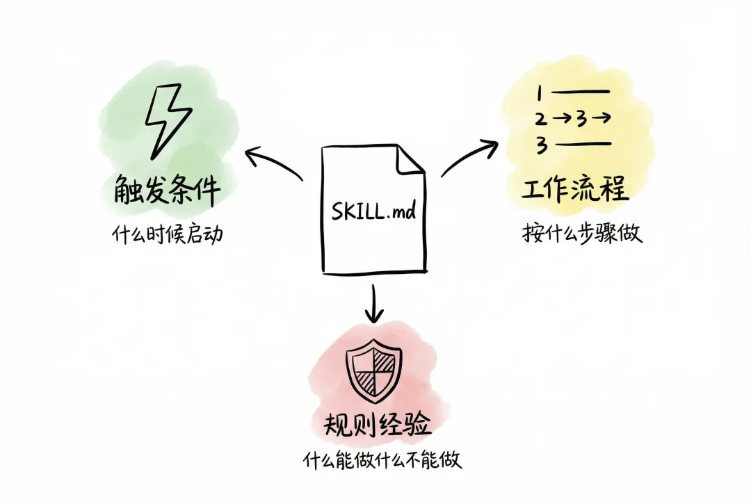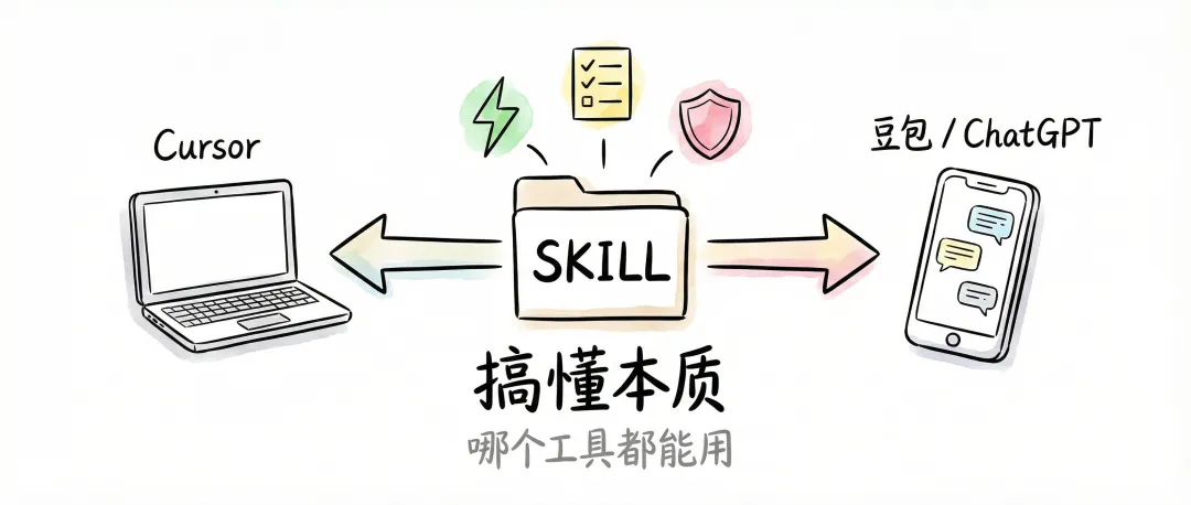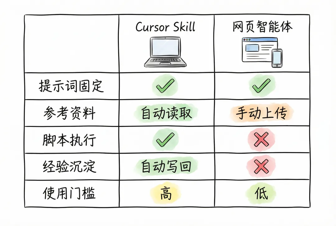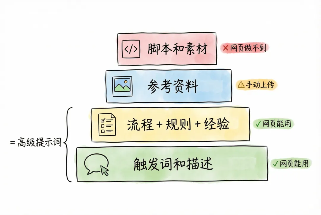 我把 Skill 的内容拆成了四层,从轻到重:第一层:触发词和描述。告诉 AI 什么时候该用这个技能。纯文本,几行字。第二层:流程 + 规则 + 经验。工作流怎么走,红线是什么,历史踩过什么坑。也是纯文本。这两层加在一起,就是一个高级提示词。复制粘贴到任何 AI 聊天框里都能用。第三层:参考资料。这里开始有「实体文件」了。拿我做的健身海报 Skill 来说,里面放了 3 张往期海报作为参考图,让 AI 学习设计风格;放了一份节气和节假日的配色表,让 AI 根据日期自动切换主题色;还有深色和浅色两版公司 Logo,根据海报背景明暗自动选择。在 Cursor 里,AI 会自己去读这些文件。但在网页聊天里,你得手动把参考图上传进去、把配色规则粘贴进去。能不能用?能。但操作成本高了一截。第四层:脚本和素材。还是这个健身海报 Skill,里面有一个 Python 脚本,用来把 AI 生成的 HTML 海报转成 PNG 图片。在 Cursor 里,AI 写完 HTML 之后会自己调用这个脚本,直接输出成品图片。这一层在网页聊天里做不到。因为网页 AI 没有 Shell,跑不了代码。你只能拿到 HTML,在浏览器里打开后手动截图。所以结论是:前两层人人都能用,第三层手动喂也能用,第四层是 IDE 工具的独有优势。